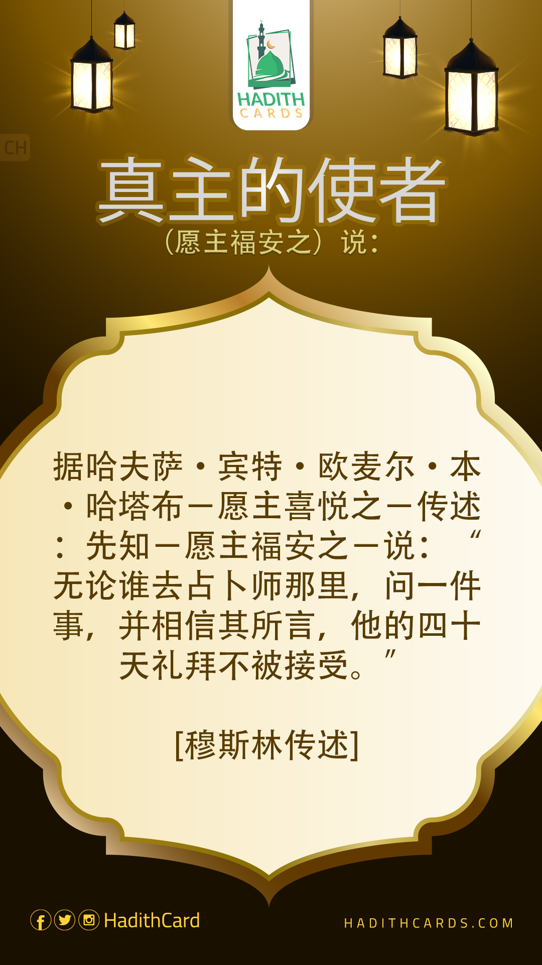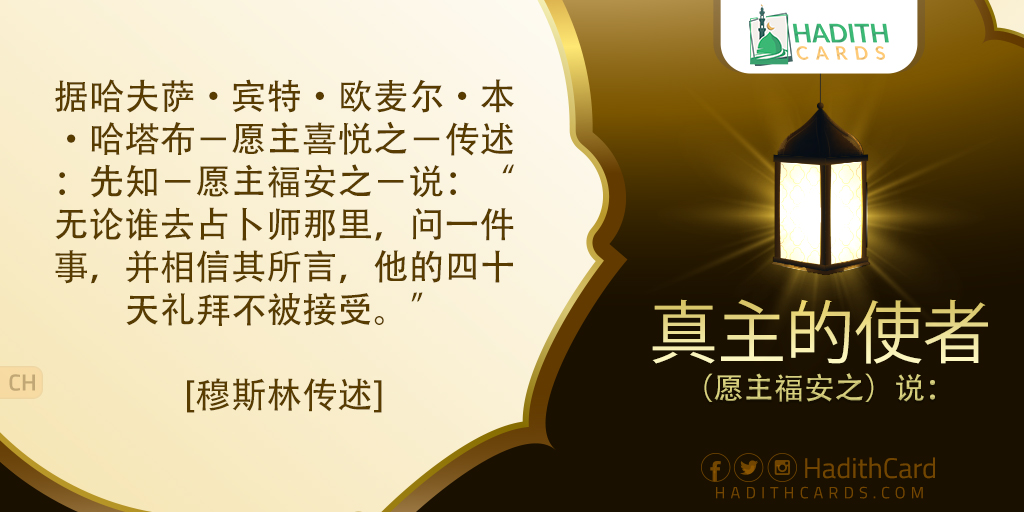 据哈夫萨·宾特·欧麦尔·本·哈塔布-愿主喜悦之-传述:先知-愿主福安之-说:“无论谁去占卜师那里,问一件事,并相信其所言,他的四十天礼拜不被接受