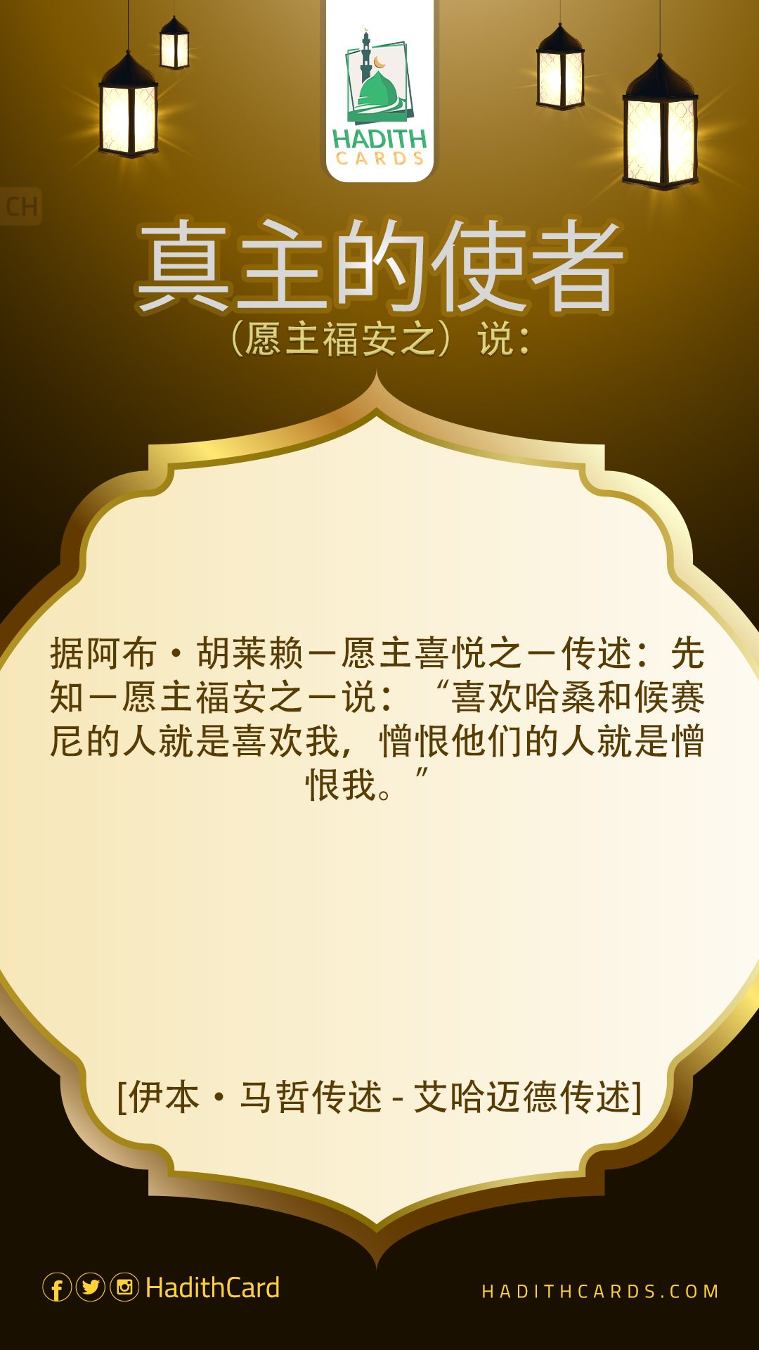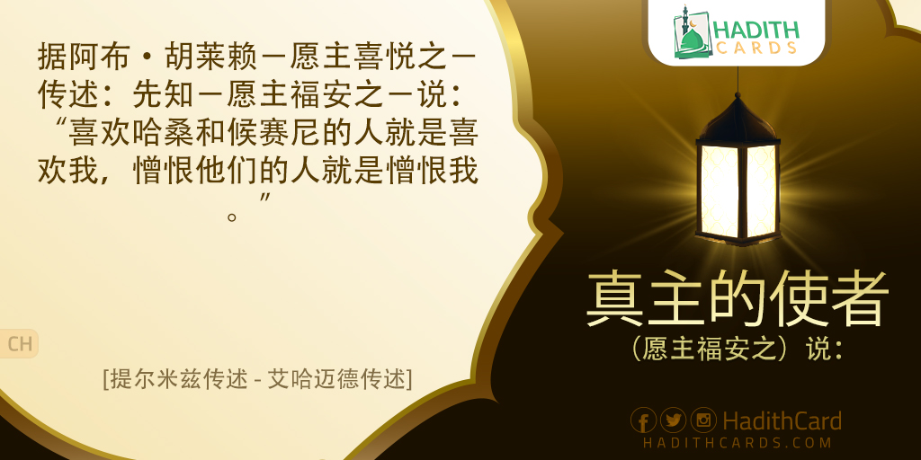 据阿布·胡莱赖-愿主喜悦之-传述:先知-愿主福安之-说:“喜欢哈桑和候赛尼的人就是喜欢我,憎恨他们的人就是憎恨我