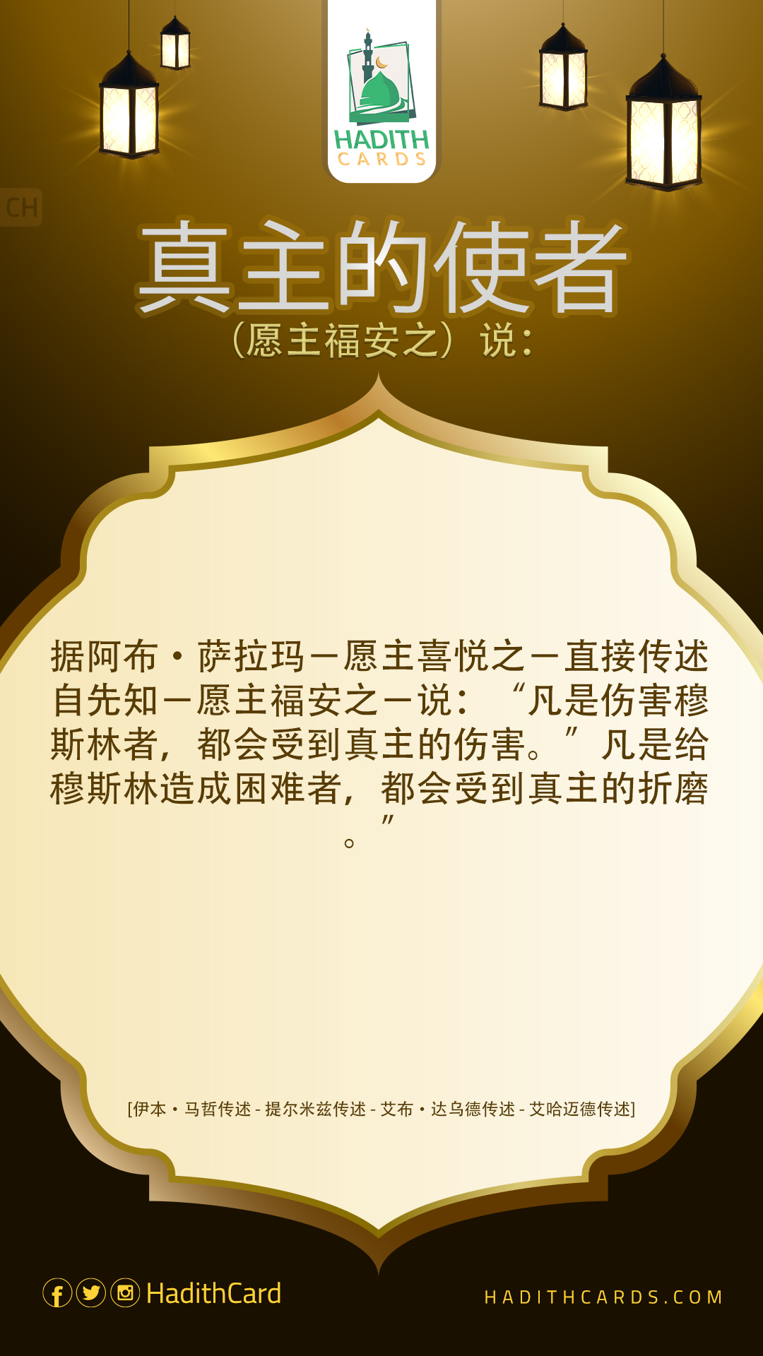 据阿布·萨拉玛-愿主喜悦之-直接传述自先知-愿主福安之-说:“凡是伤害穆斯林者,都会受到真主的伤害。”凡是给穆斯林造成困难者,都会受到真主的折磨。