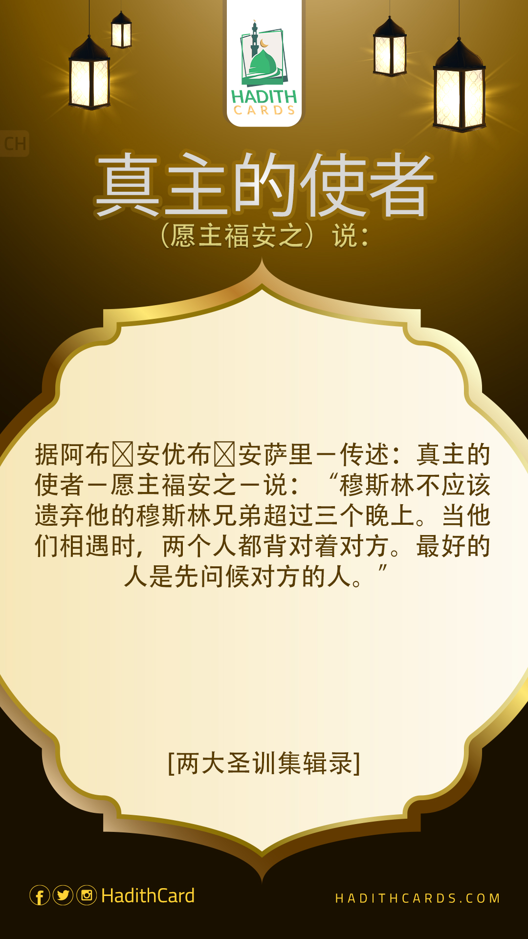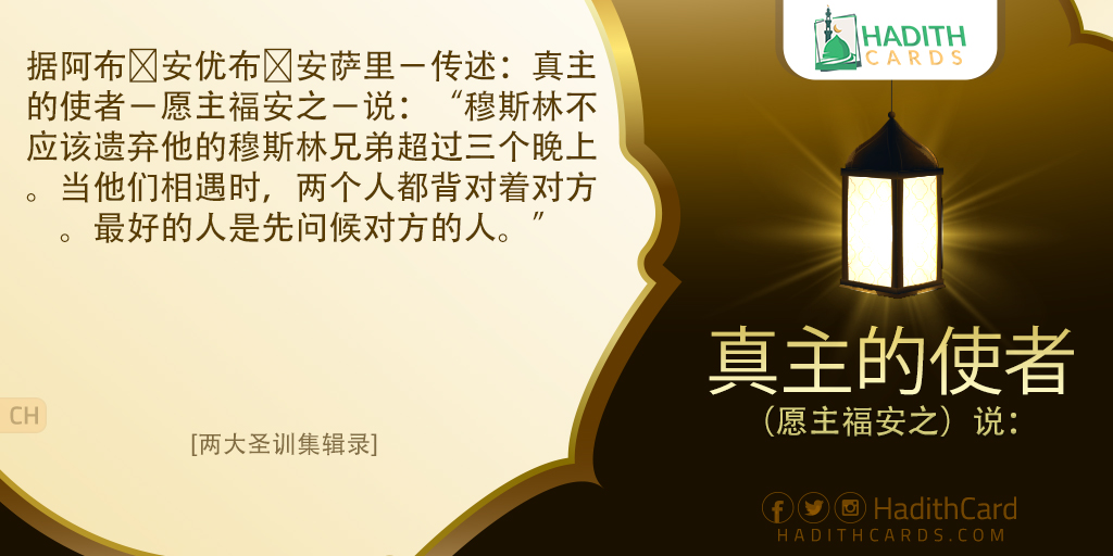 据阿布∙安优布∙安萨里-传述:真主的使者-愿主福安之-说:“穆斯林不应该遗弃他的穆斯林兄弟超过三个晚上。当他们相遇时,两个人都背对着对方。最好的人是先问候对方的人