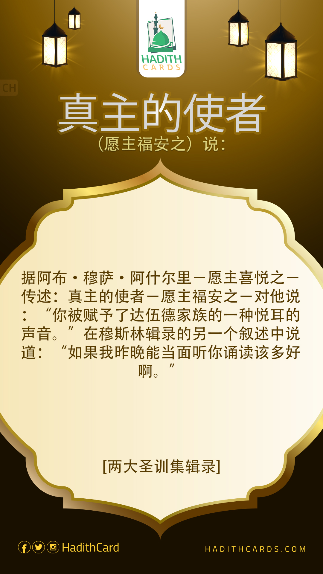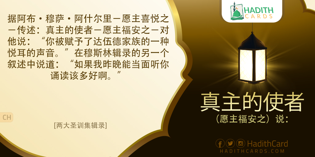 据阿布·穆萨·阿什尔里-愿主喜悦之-传述:真主的使者-愿主福安之-对他说:“你被赋予了达伍德家族的一种悦耳的声音。”在穆斯林辑录的另一个叙述中说道:“如果我昨晚能当面听你诵读该多好啊