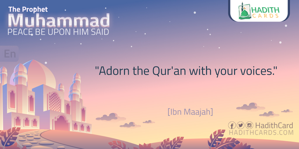 قَالَ رَسُولُ اللَّهِ ﷺ «زَيِّنُوا القرآنَ بأصواتِكم».رواه أحمد، وأبو داود، والنسائي، وابن ماجه
