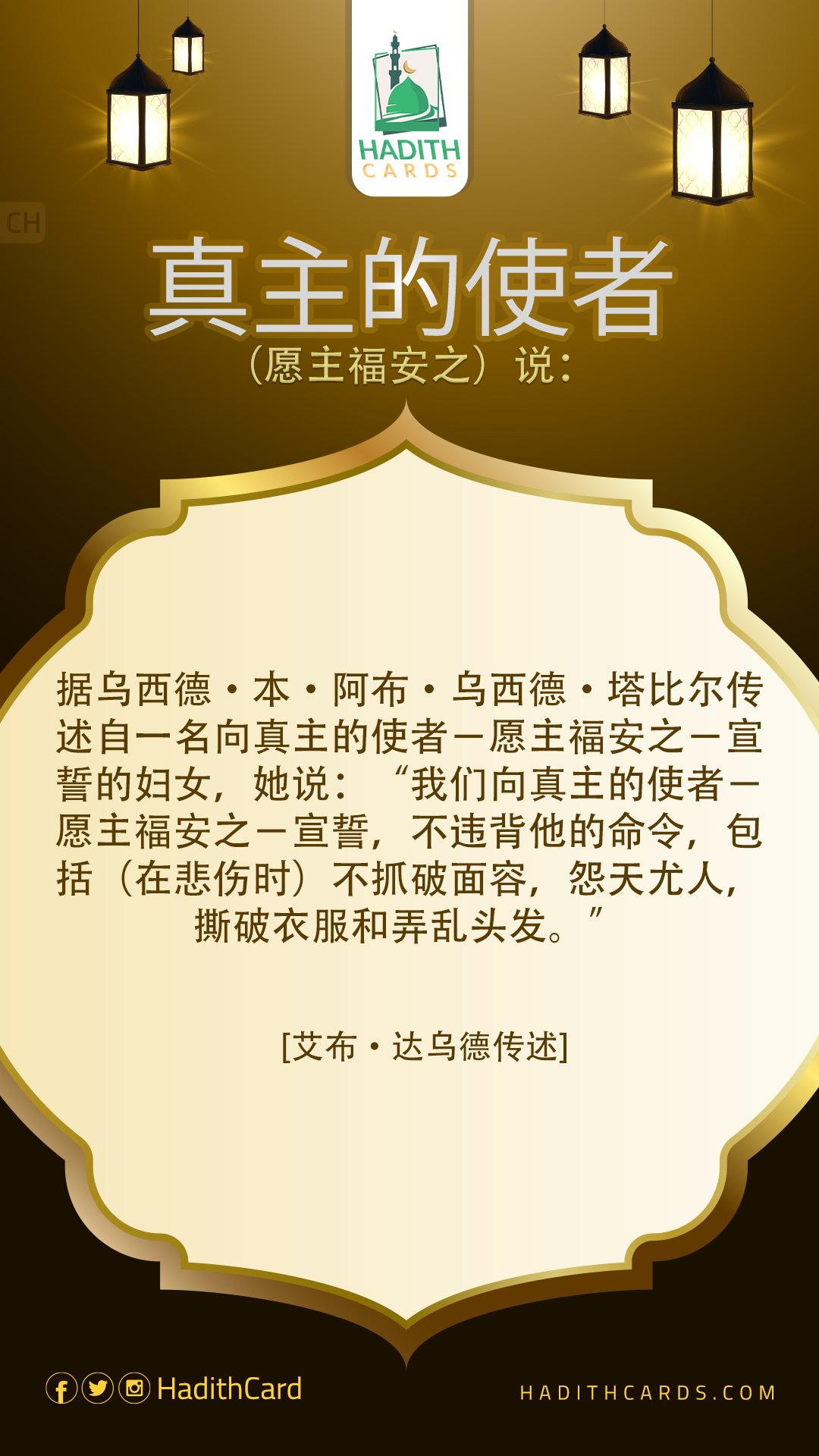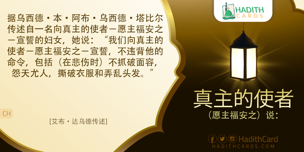 عن أسيد بن أبي أسيد التابعي، عن امرأة من المبايعات، قالت: كان فيما أخذ علينا رسولُ الله -صلى الله عليه وسلم- في المعروف الذي أخذ علينا أن لا نعصيه فيه: أن لا نَخْمِشَ وجهًا، ولا نَدْعُوَ وَيْلًا، ولا نَشُقَّ جَيْبًا، وأن لا نَنْشُرَ شَعْرًا.