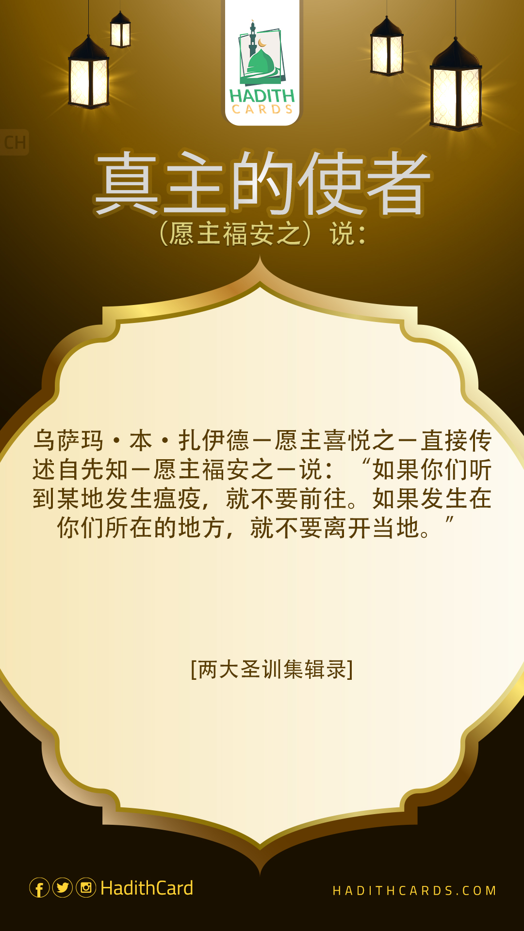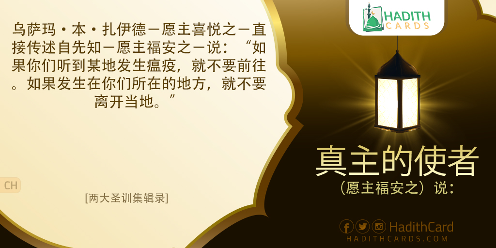 乌萨玛·本·扎伊德-愿主喜悦之-直接传述自先知-愿主福安之-说:“如果你们听到某地发生瘟疫,就不要前往。如果发生在你们所在的地方,就不要离开当地。