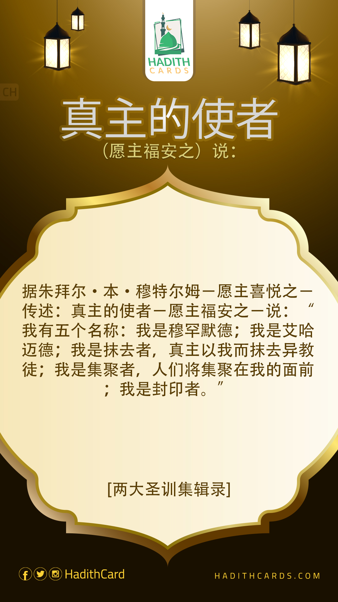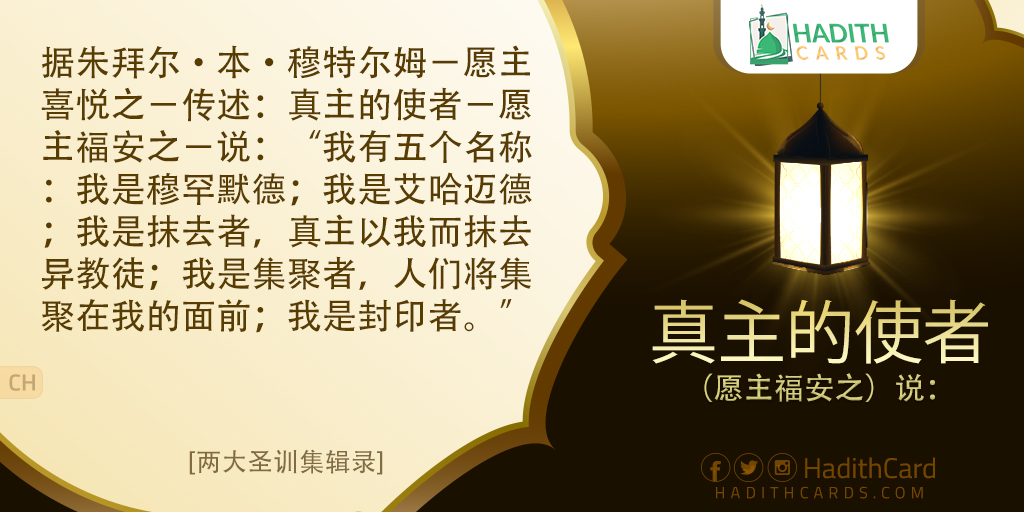 据朱拜尔·本·穆特尔姆-愿主喜悦之-传述:真主的使者-愿主福安之-说:“我有五个名称:我是穆罕默德;我是艾哈迈德;我是抹去者,真主以我而抹去异教徒;我是集聚者,人们将集聚在我的面前;我是封印者