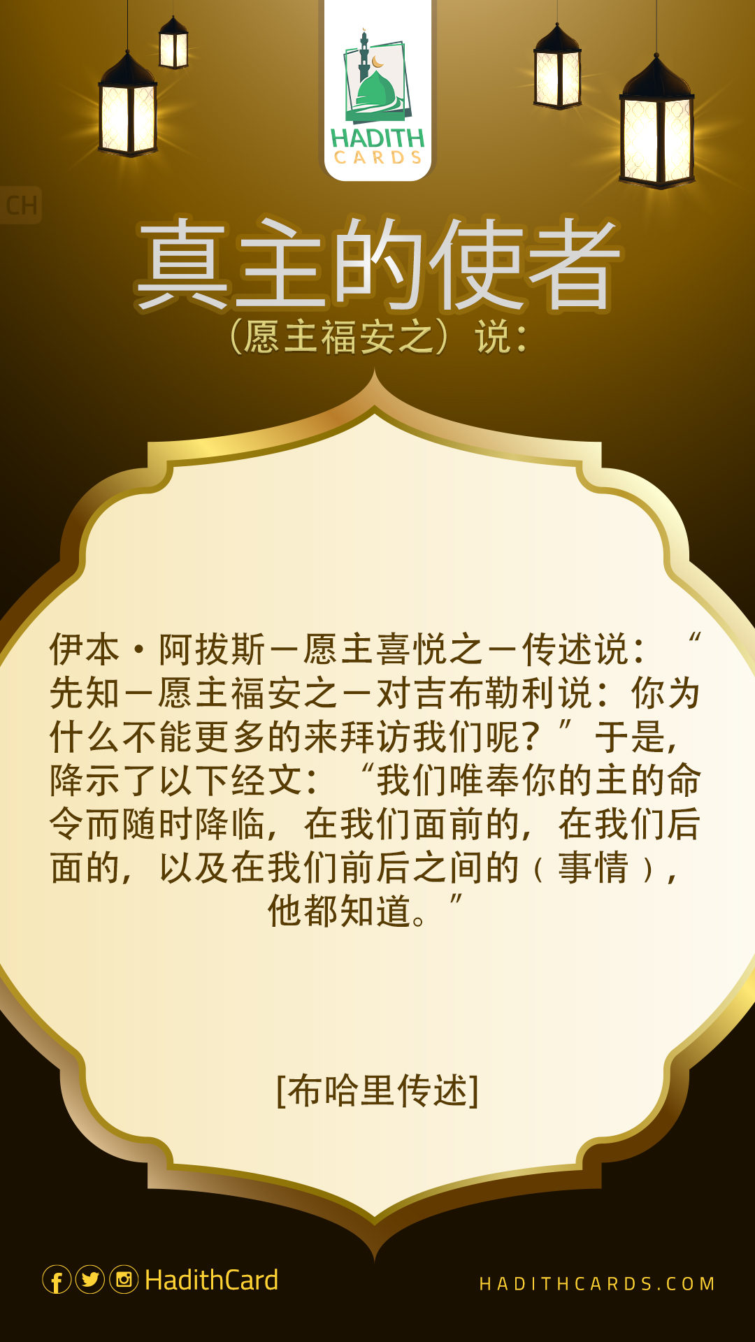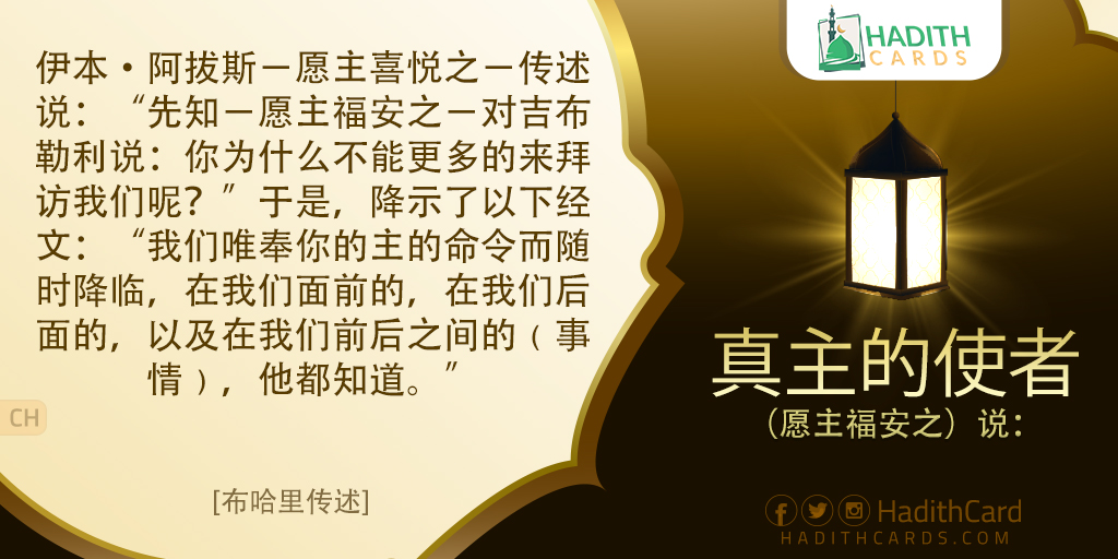 伊本·阿拔斯-愿主喜悦之-传述说:“先知-愿主福安之-对吉布勒利说:你为什么不能更多的来拜访我们呢?”于是,降示了以下经文:“我们唯奉你的主的命令而随时降临,在我们面前的,在我们后面的,以及在我们前后之间的﹙事情﹚,他都知道