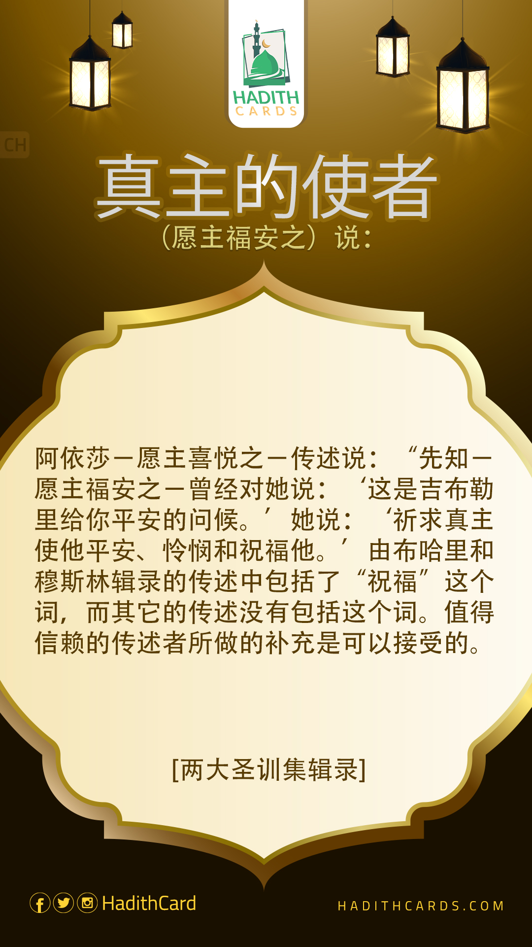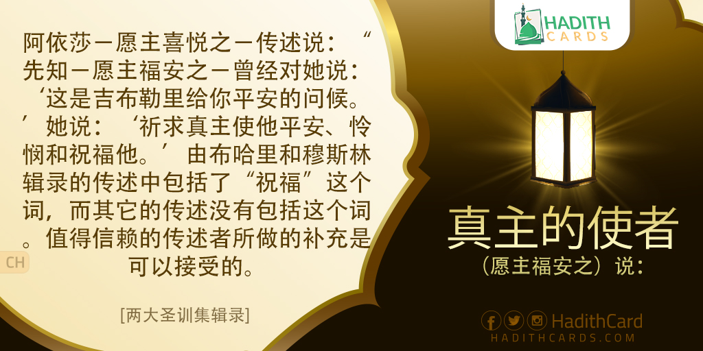 阿依莎-愿主喜悦之-传述说:“先知-愿主福安之-曾经对她说:‘这是吉布勒里给你平安的问候。’她说:‘祈求真主使他平安、怜悯和祝福他。’由布哈里和穆斯林辑录的传述中包括了“祝福”这个词,而其它的传述没有包括这个词。值得信赖的传述者所做的补充是可以接受的