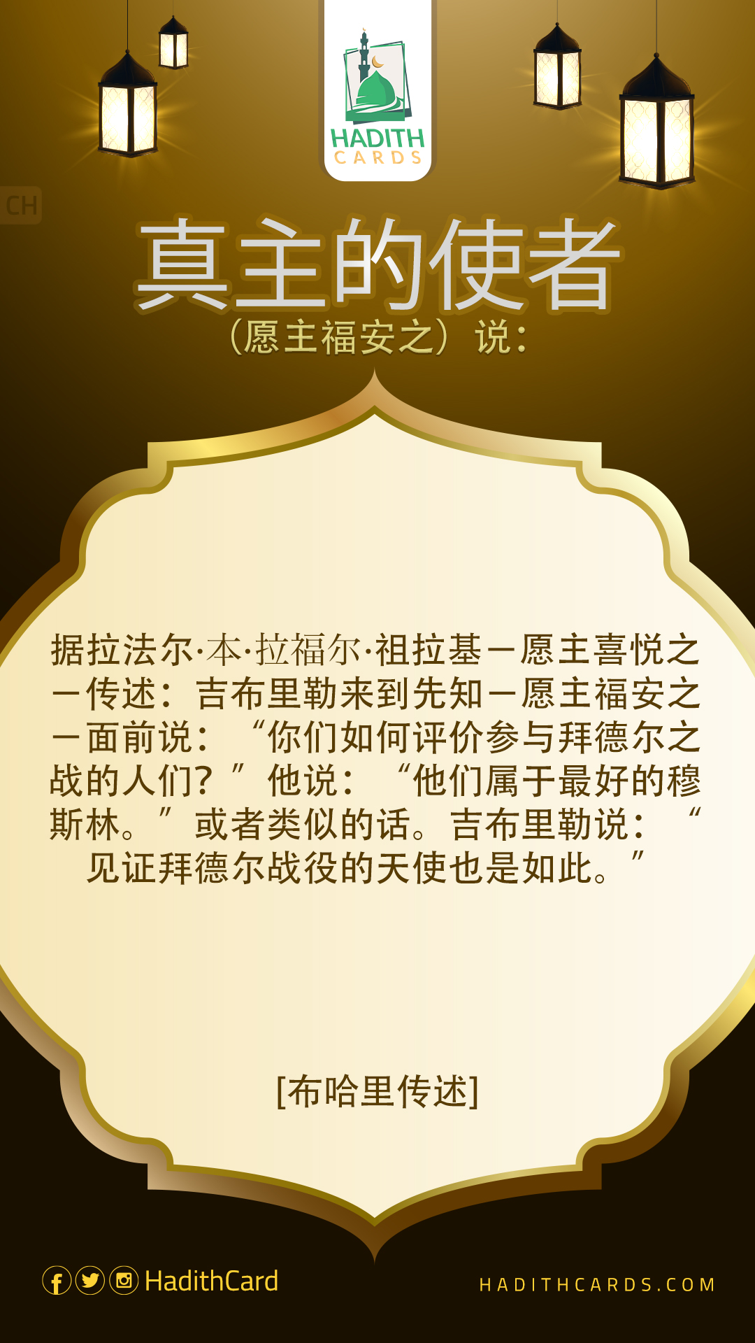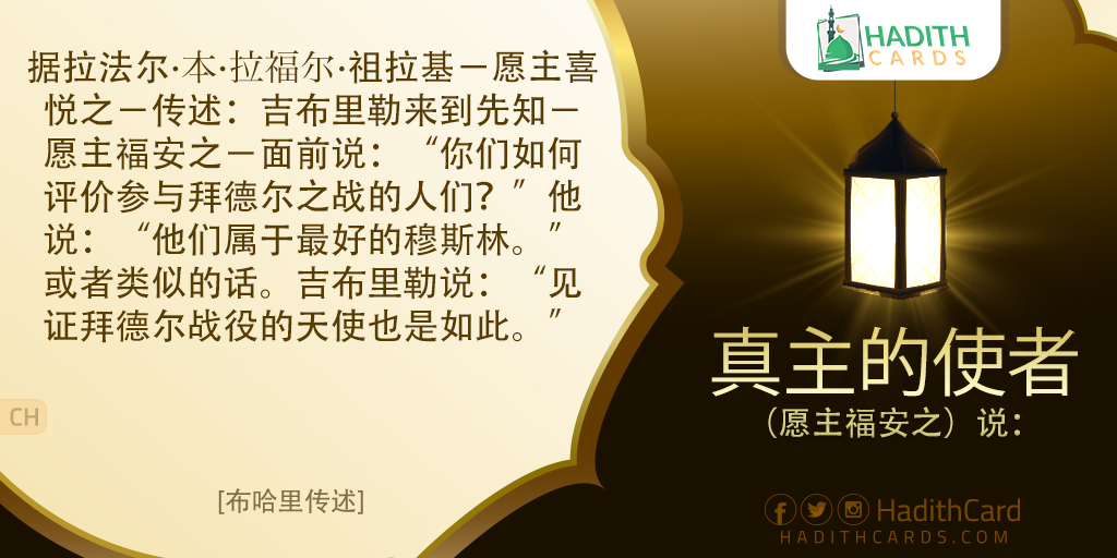 据拉法尔∙本∙拉福尔∙祖拉基-愿主喜悦之-传述:吉布里勒来到先知-愿主福安之-面前说:“你们如何评价参与拜德尔之战的人们?”他说:“他们属于最好的穆斯林。”或者类似的话。吉布里勒说:“见证拜德尔战役的天使也是如此