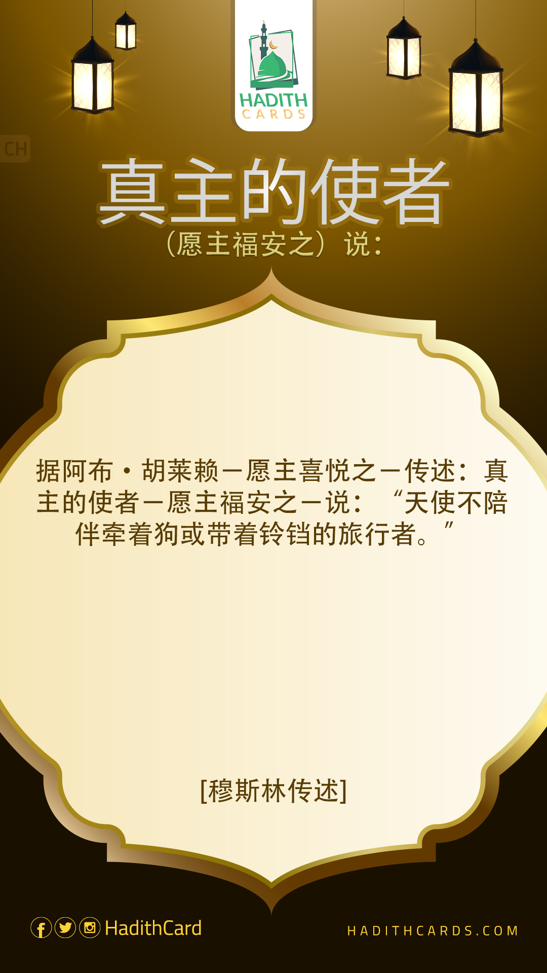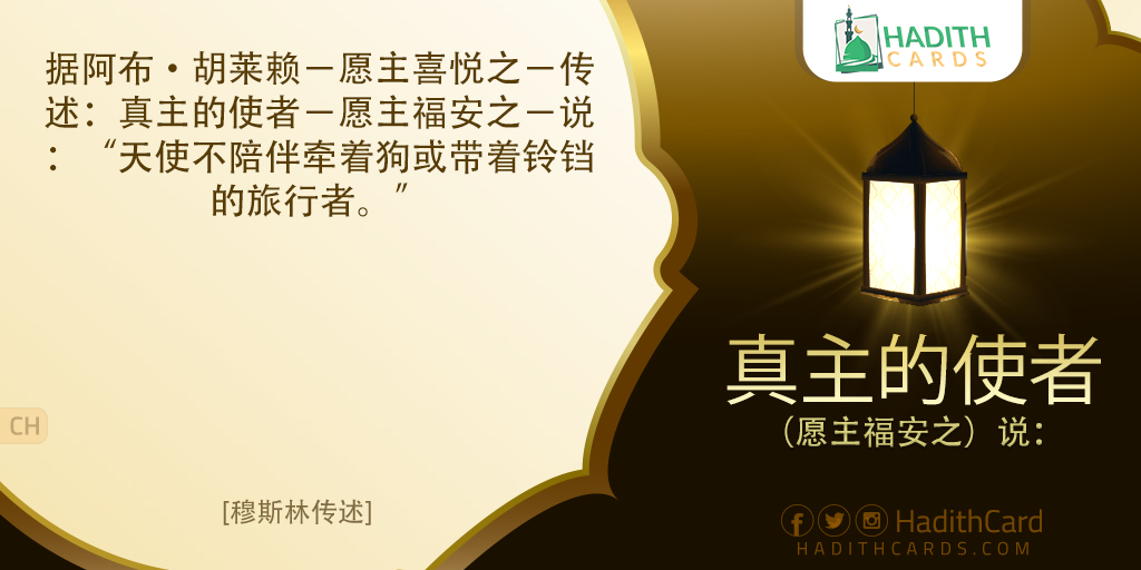 据阿布·胡莱赖-愿主喜悦之-传述:真主的使者-愿主福安之-说:“天使不陪伴牵着狗或带着铃铛的旅行者。