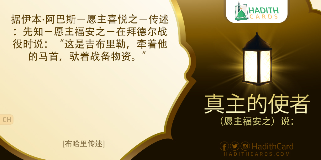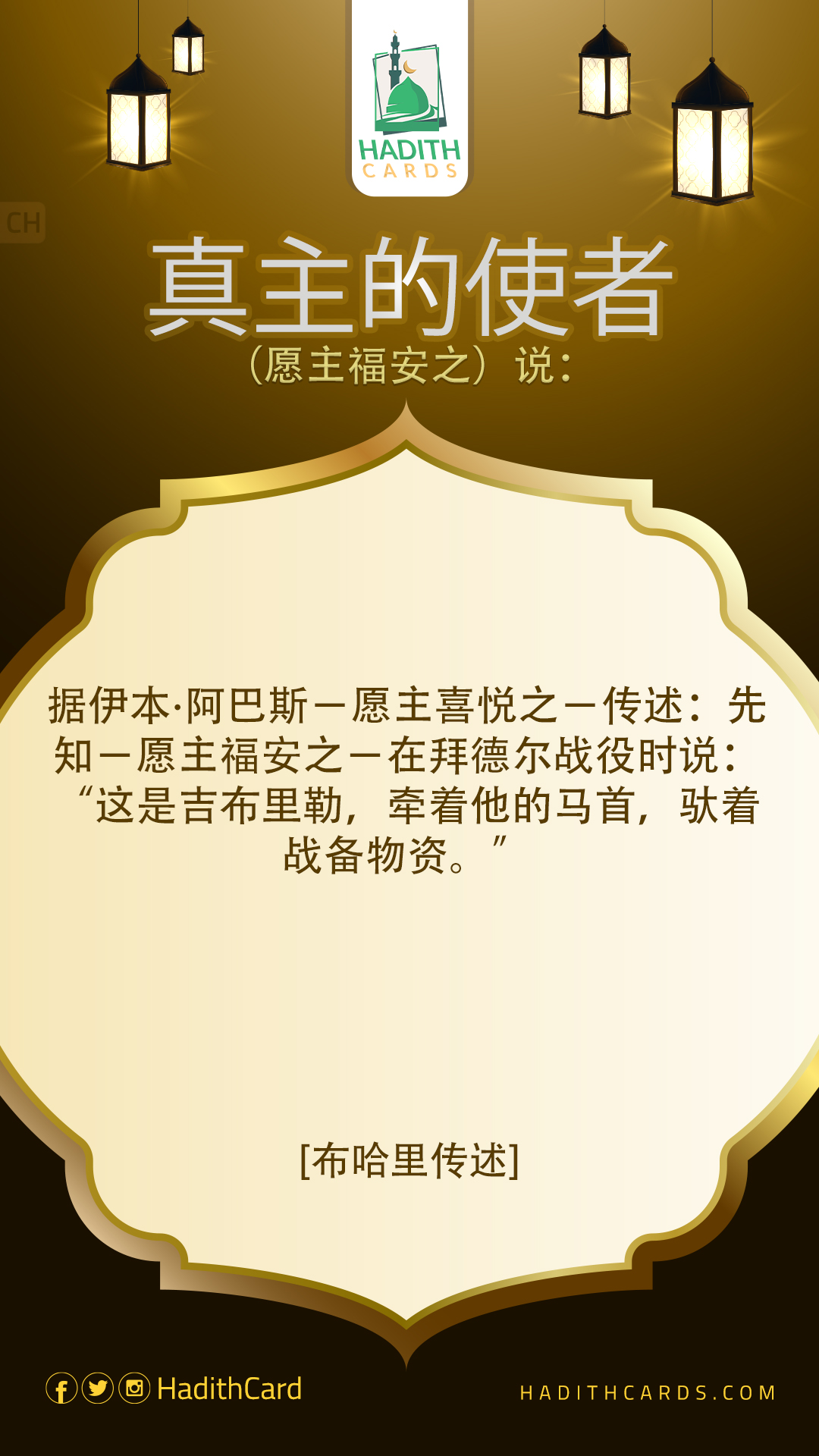 据伊本∙阿巴斯-愿主喜悦之-传述:先知-愿主福安之-在拜德尔战役时说:“这是吉布里勒,牵着他的马首,驮着战备物资