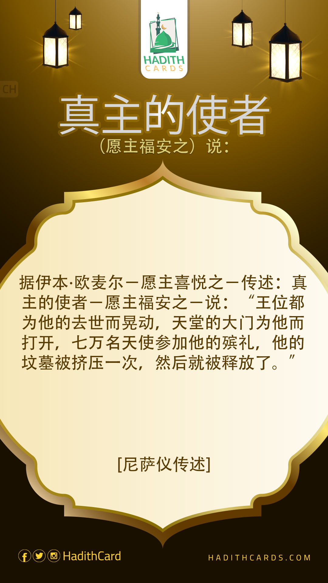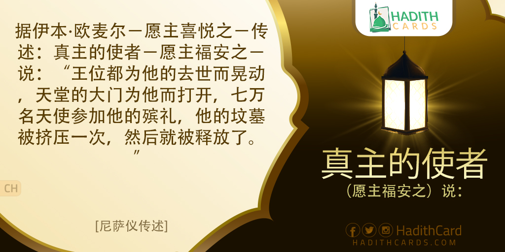 据伊本∙欧麦尔-愿主喜悦之-传述:真主的使者-愿主福安之-说:“王位都为他的去世而晃动,天堂的大门为他而打开,七万名天使参加他的殡礼,他的坟墓被挤压一次,然后就被释放了。