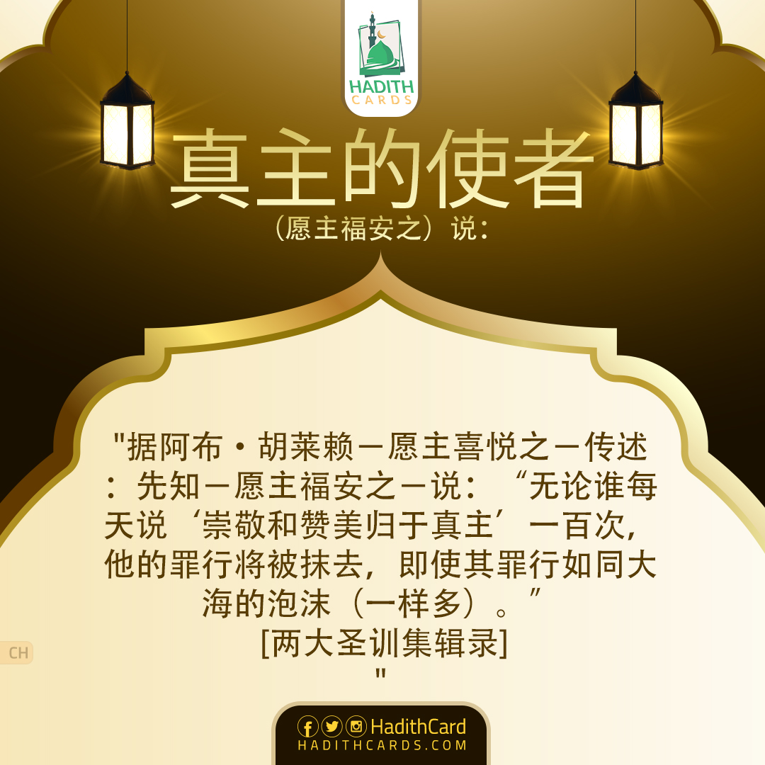 据阿布·胡莱赖-愿主喜悦之-传述:先知-愿主福安之-说:“无论谁每天说‘崇敬和赞美归于真主’一百次,他的罪行将被抹去,即使其罪行如同大海的泡沫(一样多)