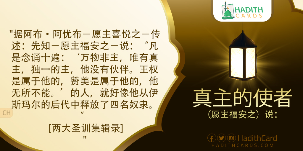 据阿布·阿优布-愿主喜悦之-传述:先知-愿主福安之-说:“凡是念诵十遍:‘万物非主,唯有真主,独一的主,他没有伙伴。王权是属于他的,赞美是属于他的,他无所不能。’的人,就好像他从伊斯玛尔的后代中释放了四名奴隶。