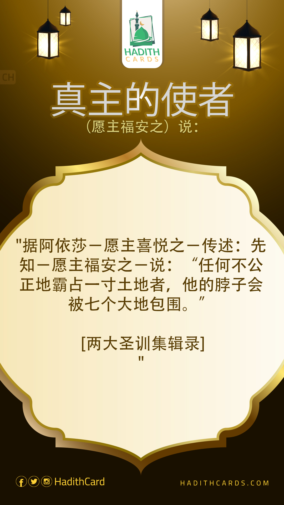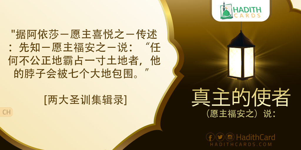 据阿依莎-愿主喜悦之-传述:先知-愿主福安之-说:“任何不公正地霸占一寸土地者,他的脖子会被七个大地包围。