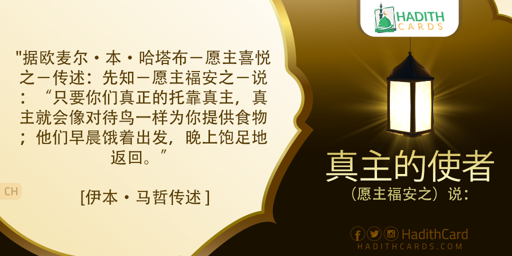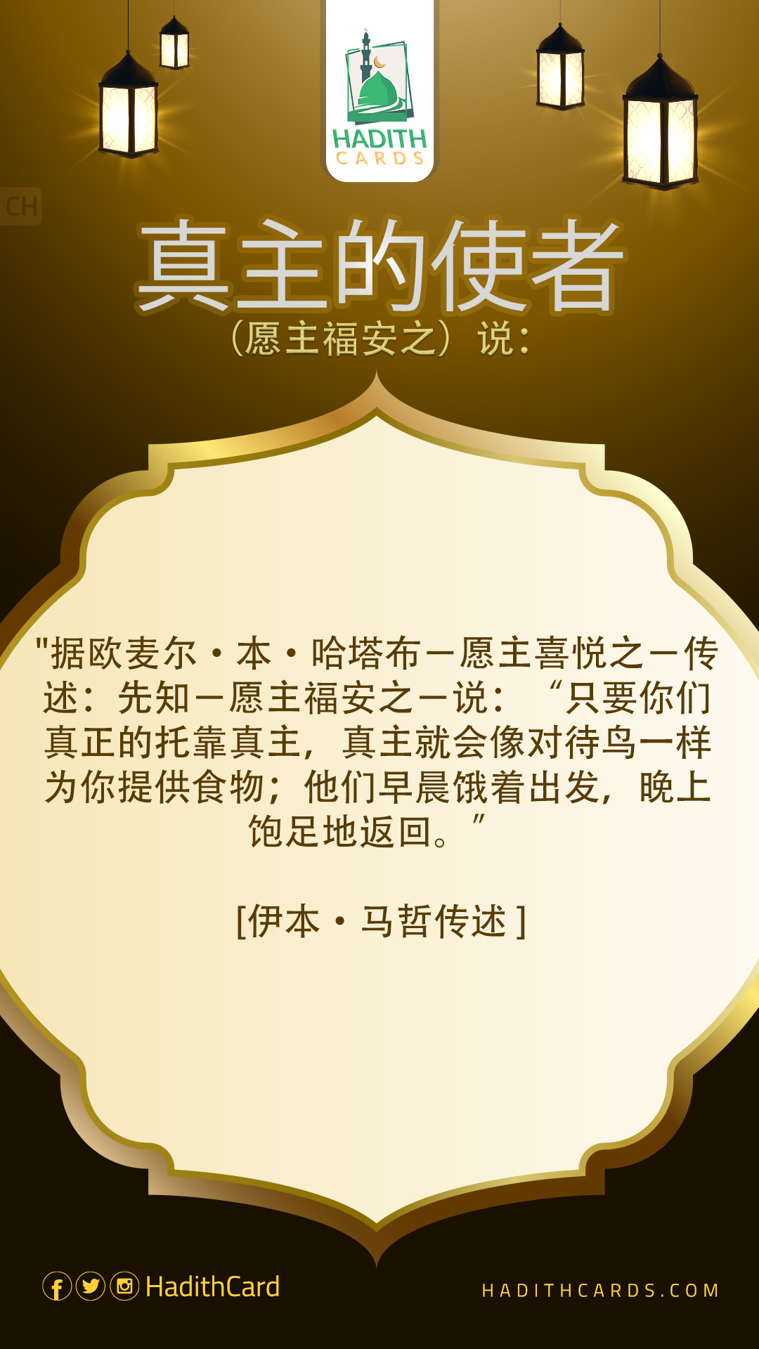 据欧麦尔·本·哈塔布-愿主喜悦之-传述:先知-愿主福安之-说:“只要你们真正的托靠真主,真主就会像对待鸟一样为你提供食物;他们早晨饿着出发,晚上饱足地返回。