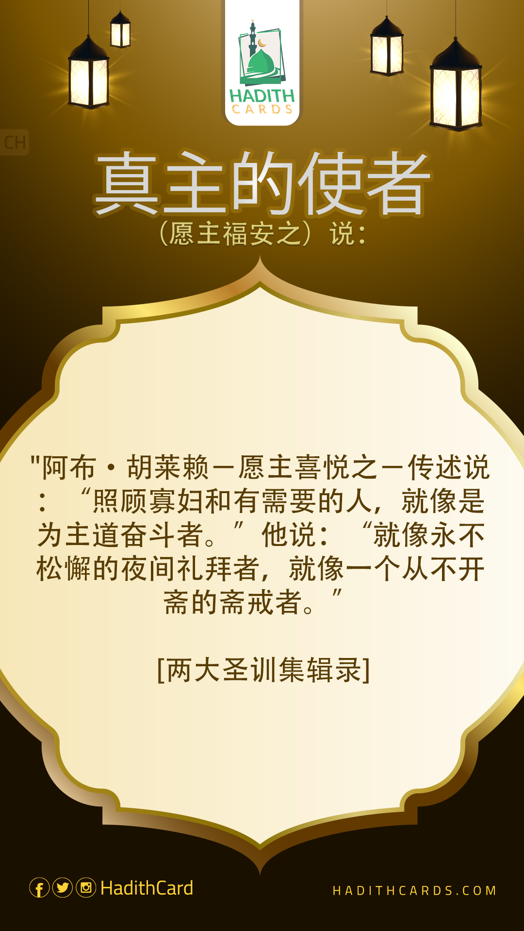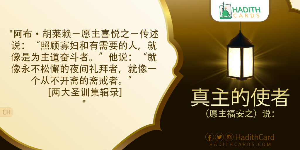 阿布·胡莱赖-愿主喜悦之-传述说:“照顾寡妇和有需要的人,就像是为主道奋斗者。”他说:“就像永不松懈的夜间礼拜者,就像一个从不开斋的斋戒者