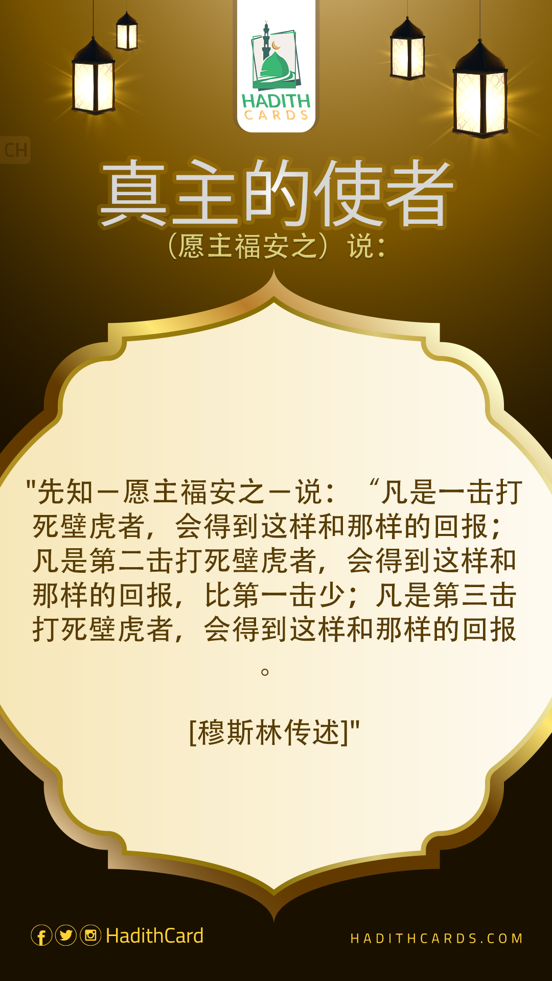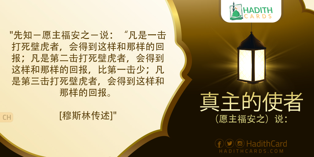 先知-愿主福安之-说:“凡是一击打死壁虎者,会得到这样和那样的回报;凡是第二击打死壁虎者,会得到这样和那样的回报,比第一击少;凡是第三击打死壁虎者,会得到这样和那样的回报