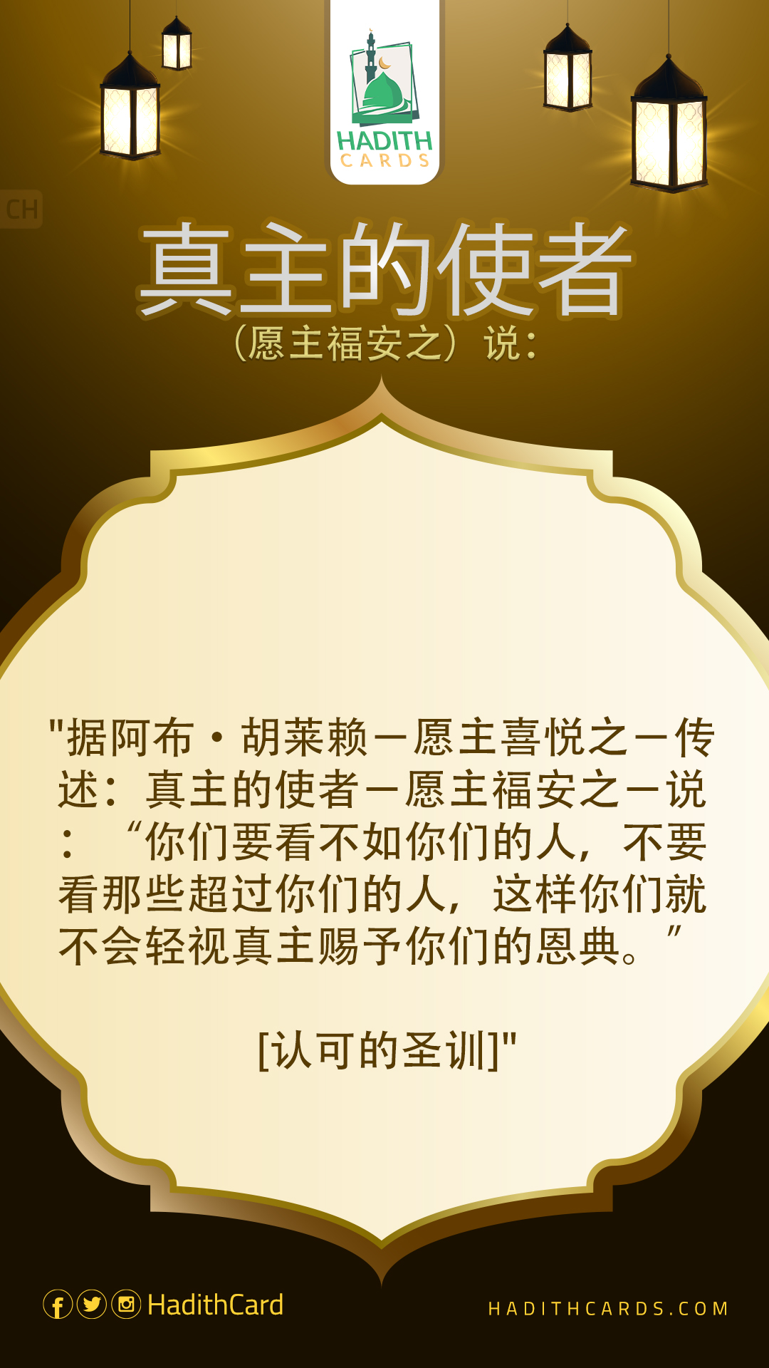 据阿布·胡莱赖-愿主喜悦之-传述:真主的使者-愿主福安之-说:“你们要看不如你们的人,不要看那些超过你们的人,这样你们就不会轻视真主赐予你们的恩典