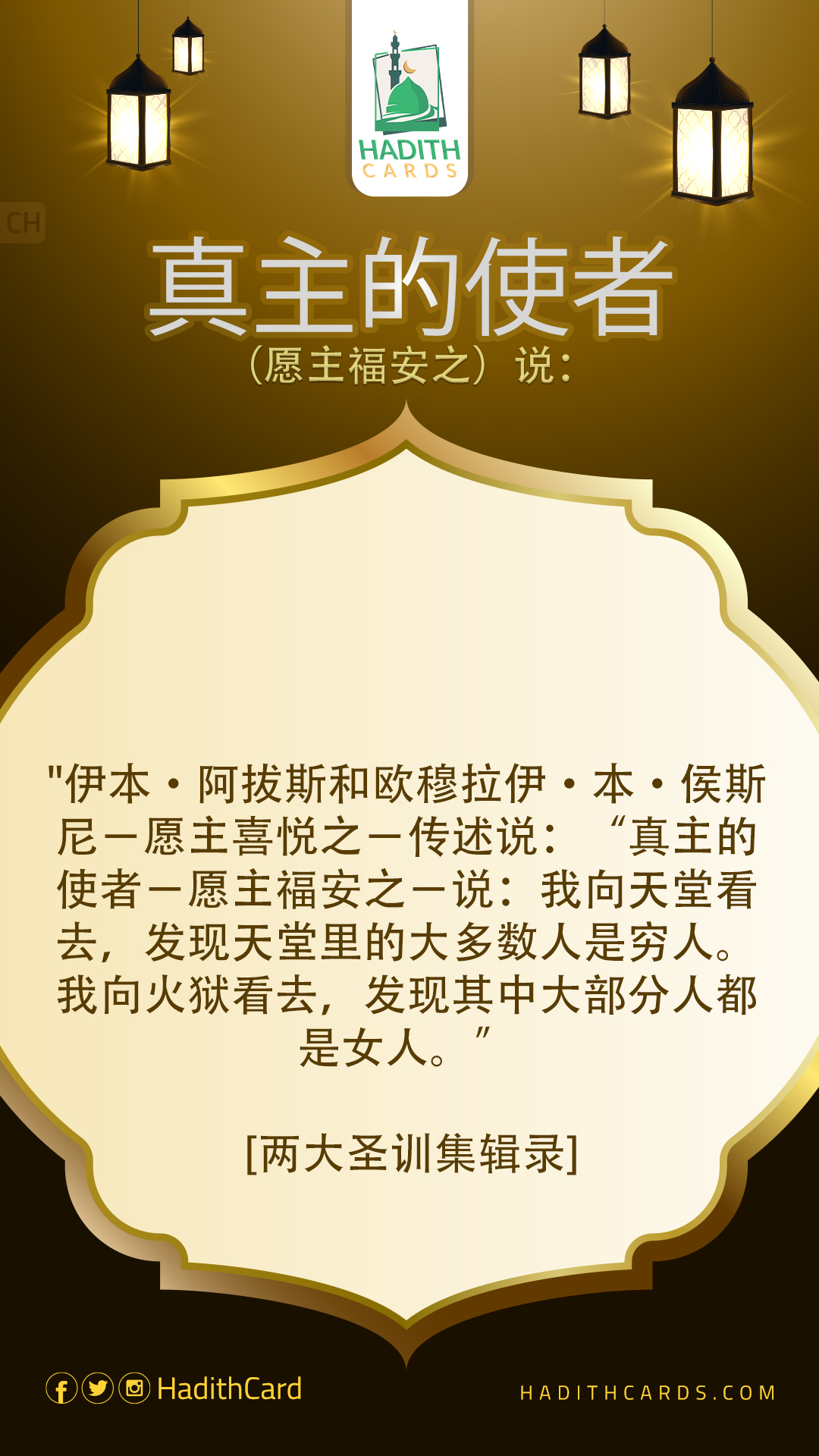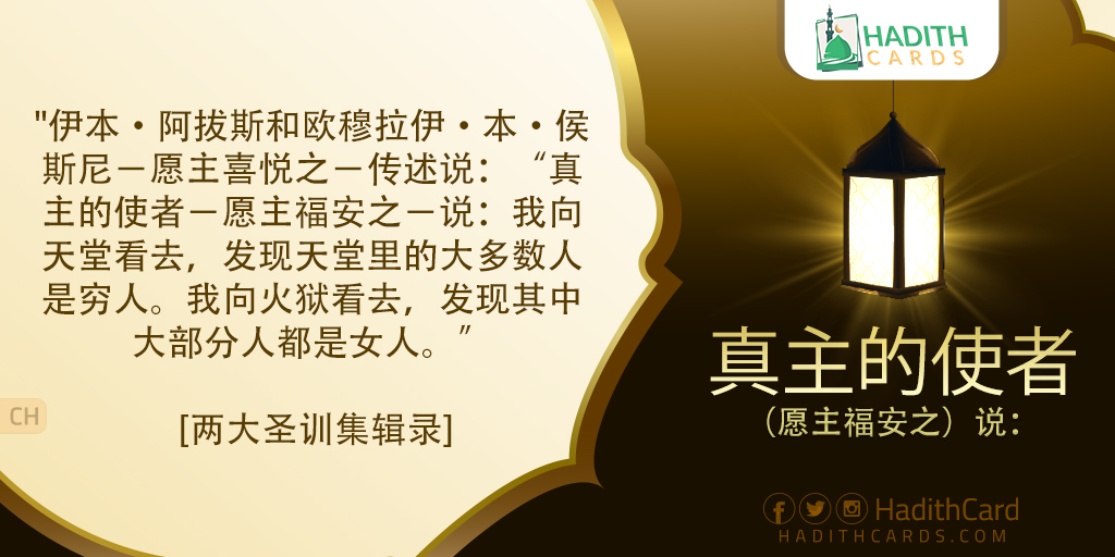 伊本·阿拔斯和欧穆拉伊·本·侯斯尼-愿主喜悦之-传述说:“真主的使者-愿主福安之-说:我向天堂看去,发现天堂里的大多数人是穷人。我向火狱看去,发现其中大部分人都是女人