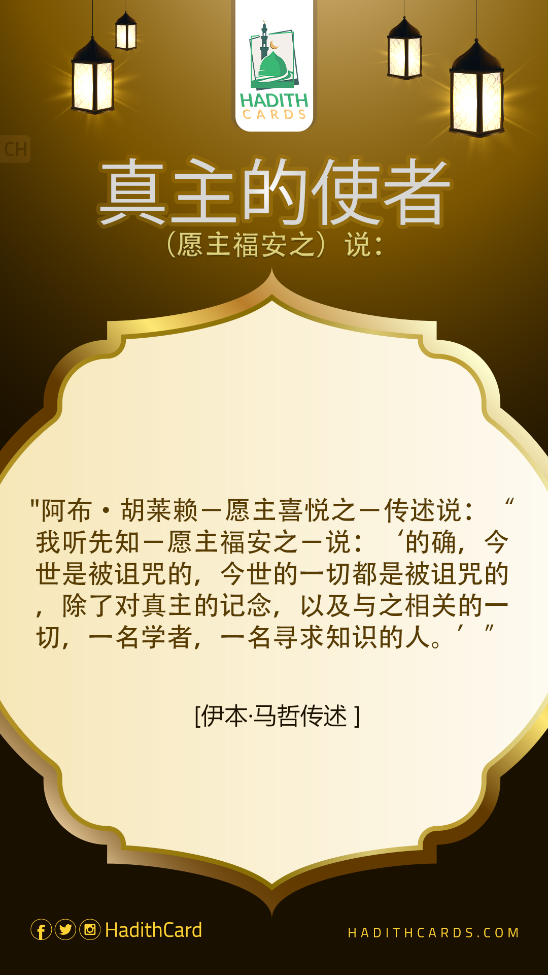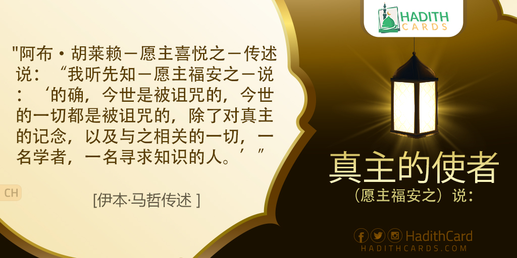 阿布·胡莱赖-愿主喜悦之-传述说:“我听先知-愿主福安之-说:‘的确,今世是被诅咒的,今世的一切都是被诅咒的,除了对真主的记念,以及与之相关的一切,一名学者,一名寻求知识的人