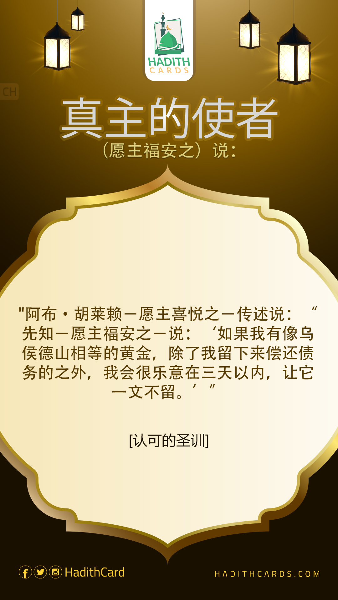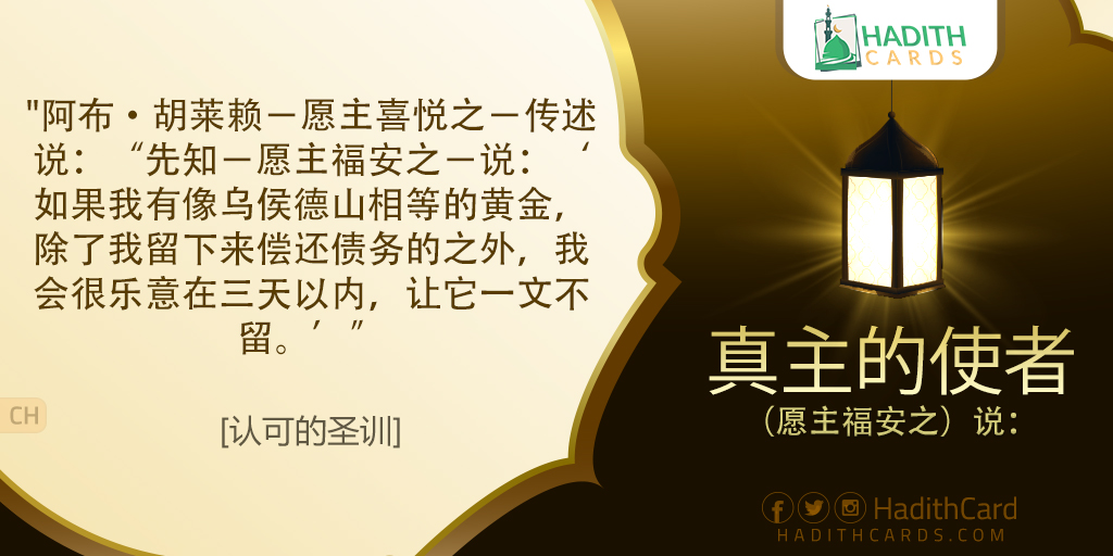 阿布·胡莱赖-愿主喜悦之-传述说:“先知-愿主福安之-说:‘如果我有像乌侯德山相等的黄金,除了我留下来偿还债务的之外,我会很乐意在三天以内,让它一文不留。