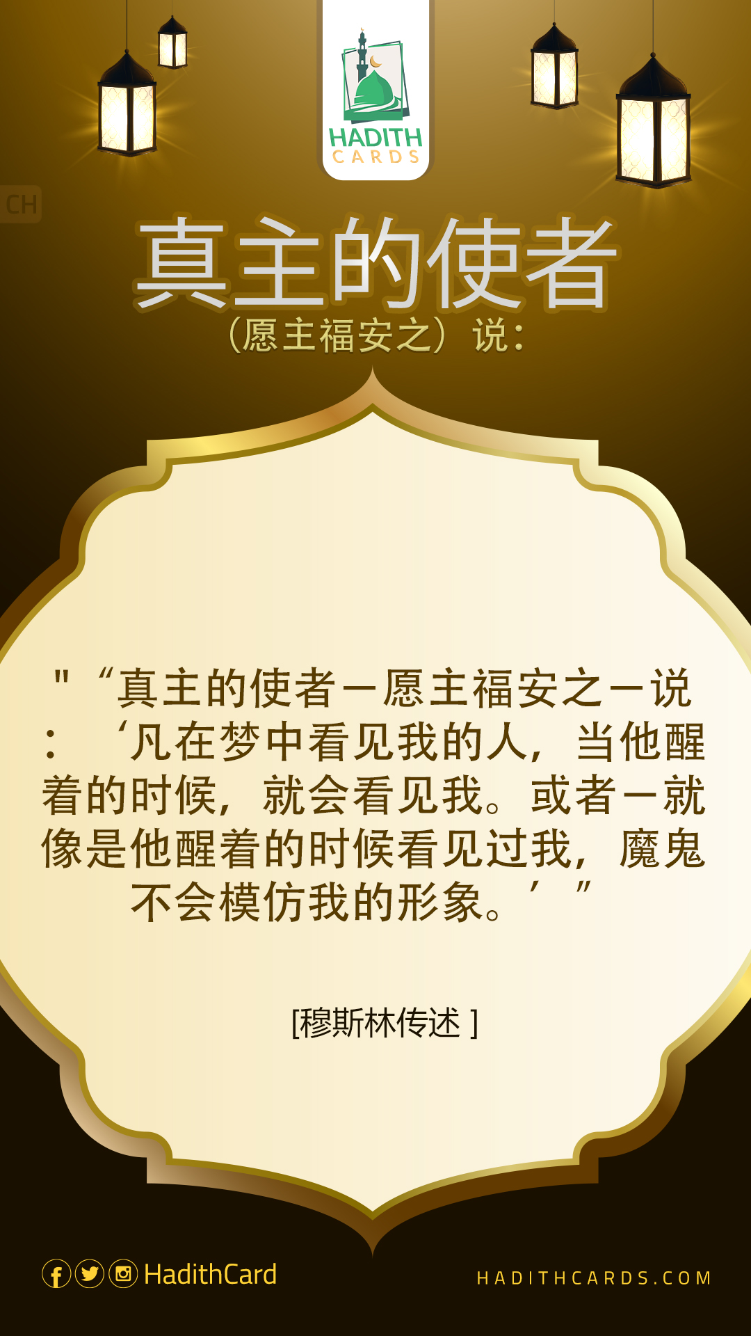 真主的使者-愿主福安之-说:‘凡在梦中看见我的人,当他醒着的时候,就会看见我。或者-就像是他醒着的时候看见过我,魔鬼不会模仿我的形象。