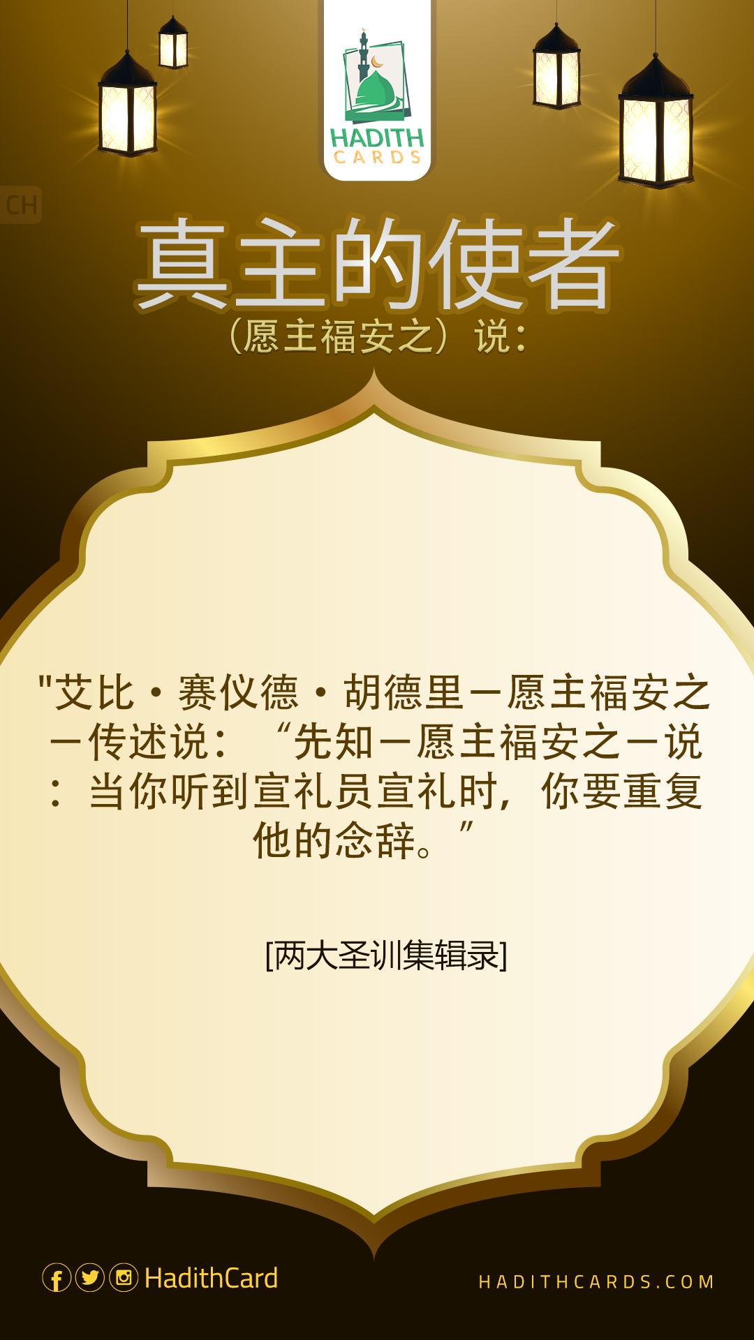 艾比•赛仪德•胡德里-愿主福安之-传述说:“先知-愿主福安之-说:当你听到宣礼员宣礼时,你要重复他的念辞。