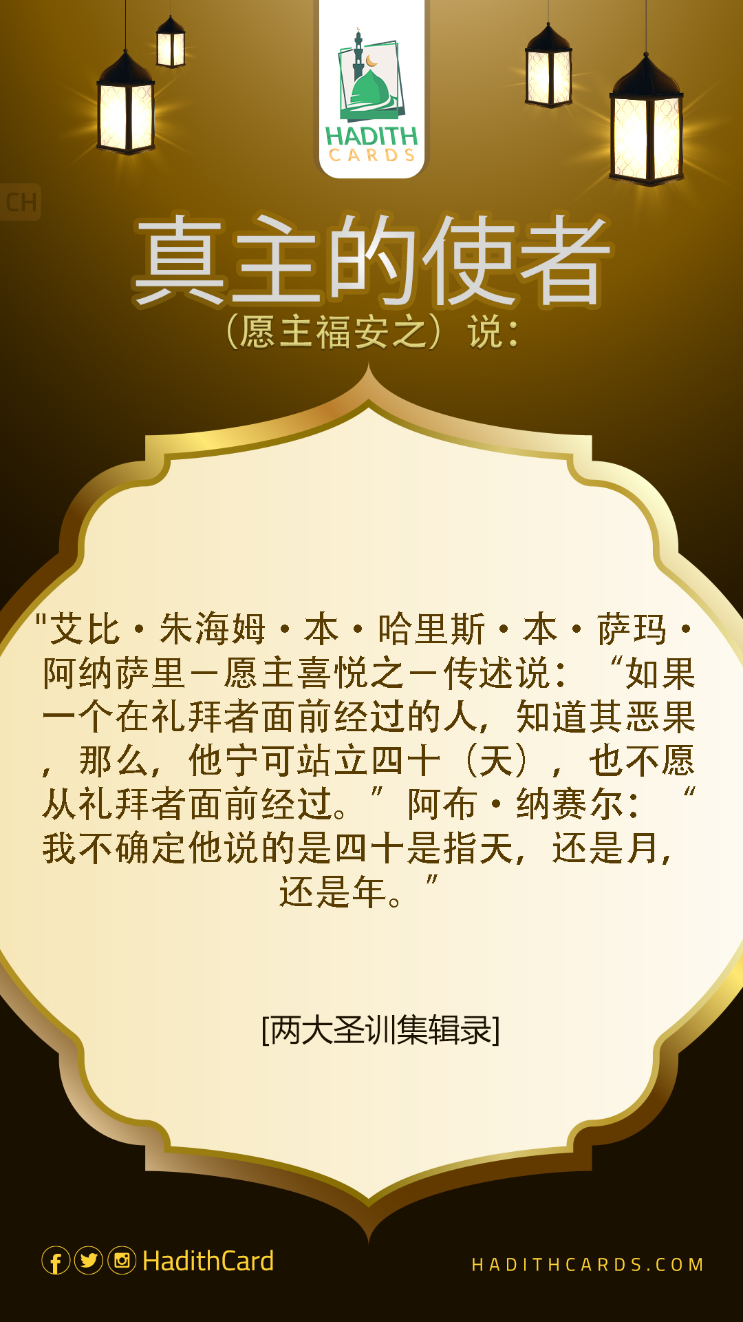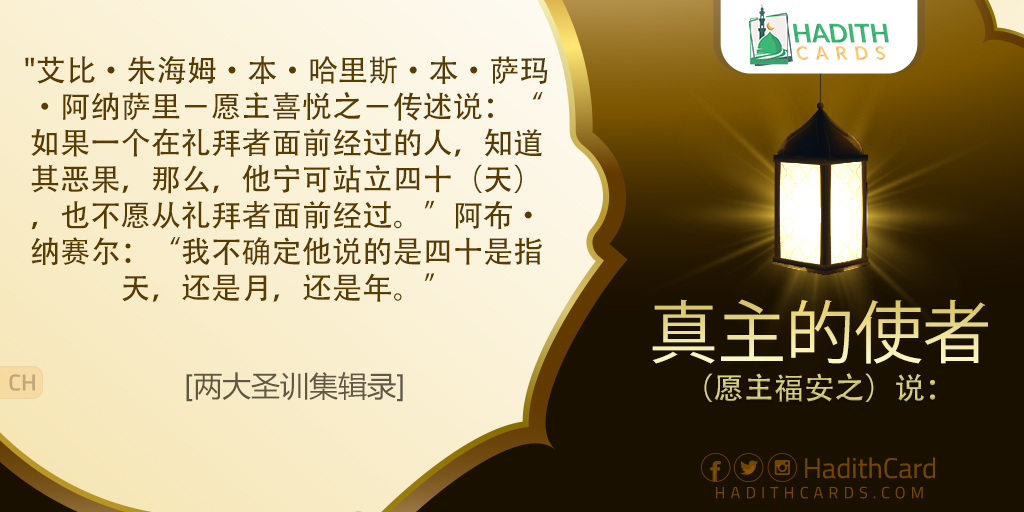 عن أبي جُهَيْمِ بْنِ الْحَارِثِ بْنِ الصِّمَّةِ الأنصاري -رضي الله عنه- مرفوعاً: «لو يعلم المار بين يدي الْمُصَلِّي ماذا عليه لكان أن يَقِفَ أربعين خيرا له من أن يَمُرَّ بين يديه». قال أَبُو النَّضْرِ: لا أدري: قال أربعين يوما أو شهرا أو سنة.