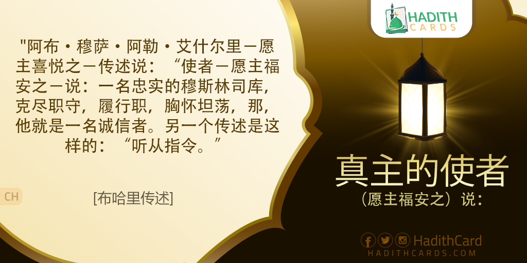 阿布·穆萨·阿勒·艾什尔里-愿主喜悦之-传述说:“使者-愿主福安之-说:一名忠实的穆斯林司库,克尽职守,履行职责,胸怀坦荡,那么,他就是一名诚信者。另一个传述是这样的:“听从指令。