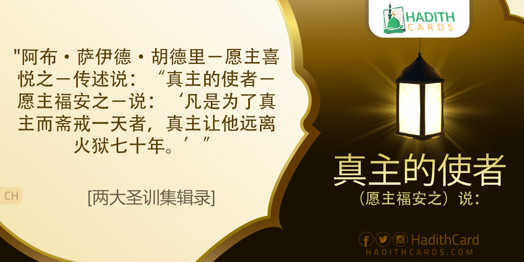 阿布·萨伊德·胡德里-愿主喜悦之-传述说:“真主的使者-愿主福安之-说:‘凡是为了真主而斋戒一天者,真主让他远离火狱七十年。