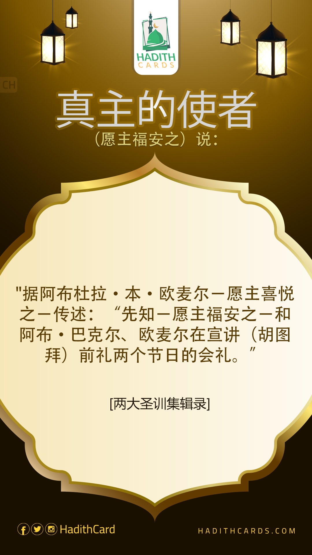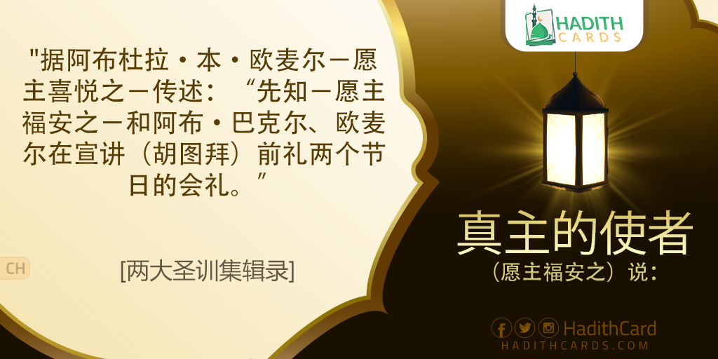 据阿布杜拉·本·欧麦尔-愿主喜悦之-传述:“先知-愿主福安之-和阿布·巴克尔、欧麦尔在宣讲(胡图拜)前礼两个节日的会礼