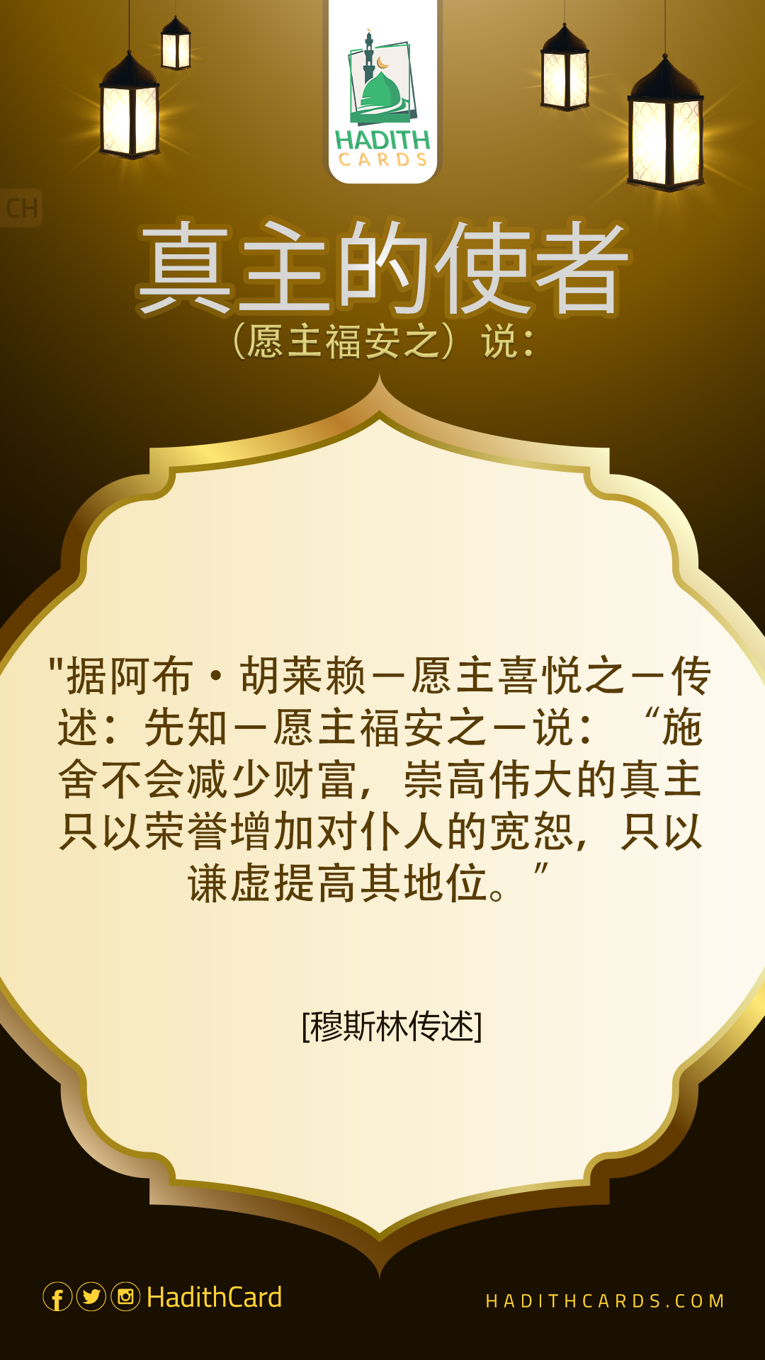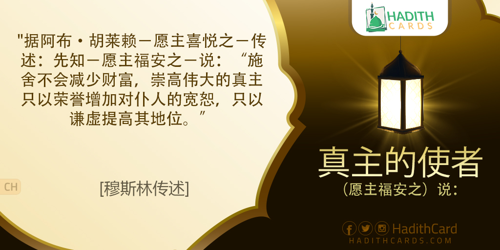据阿布·胡莱赖-愿主喜悦之-传述:先知-愿主福安之-说:“施舍不会减少财富,崇高伟大的真主只以荣誉增加对仆人的宽恕,只以谦虚提高其地位。