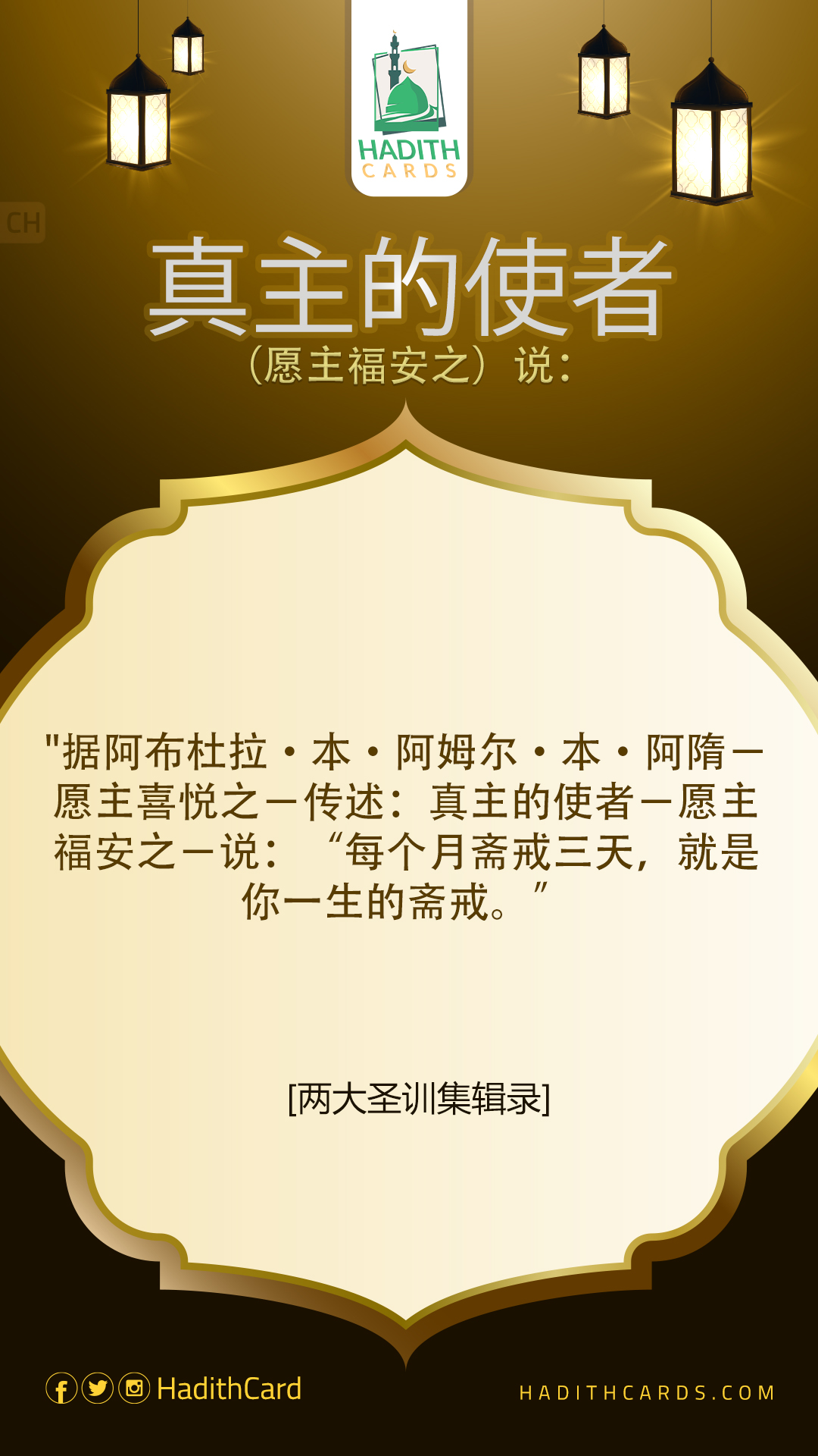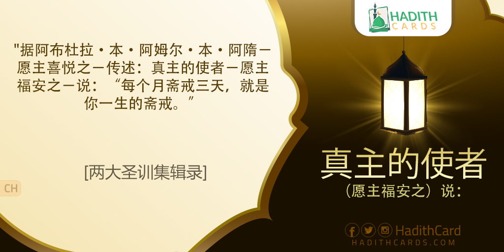 据阿布杜拉·本·阿姆尔·本·阿隋-愿主喜悦之-传述:真主的使者-愿主福安之-说:“每个月斋戒三天,就是你一生的斋戒。