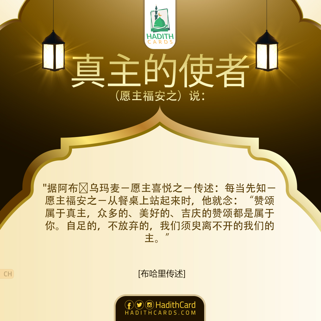据阿布∙乌玛麦-愿主喜悦之-传述:每当先知-愿主福安之-从餐桌上站起来时,他就念:“赞颂属于真主,众多的、美好的、吉庆的赞颂都是属于你。自足的,不放弃的,我们须臾离不开的我们的主
