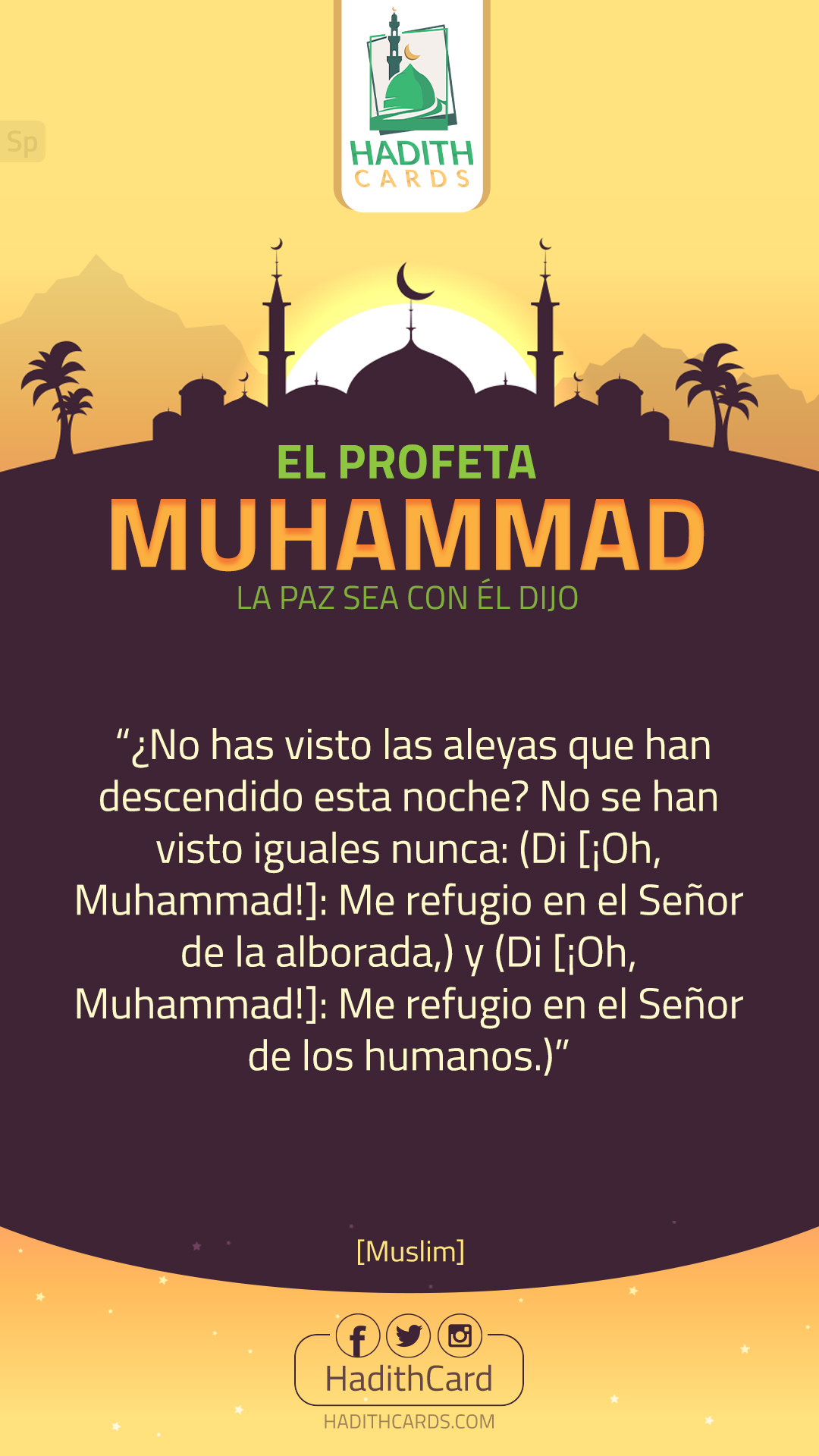 ¿No has visto las aleyas que han descendido esta noche? No se han visto iguales nunca: (Di [¡Oh, Muhammad!]: Me refugio en el Señor de la alborada,) y (Di [¡Oh, Muhammad!]: Me refugio en el Señor de los humanos