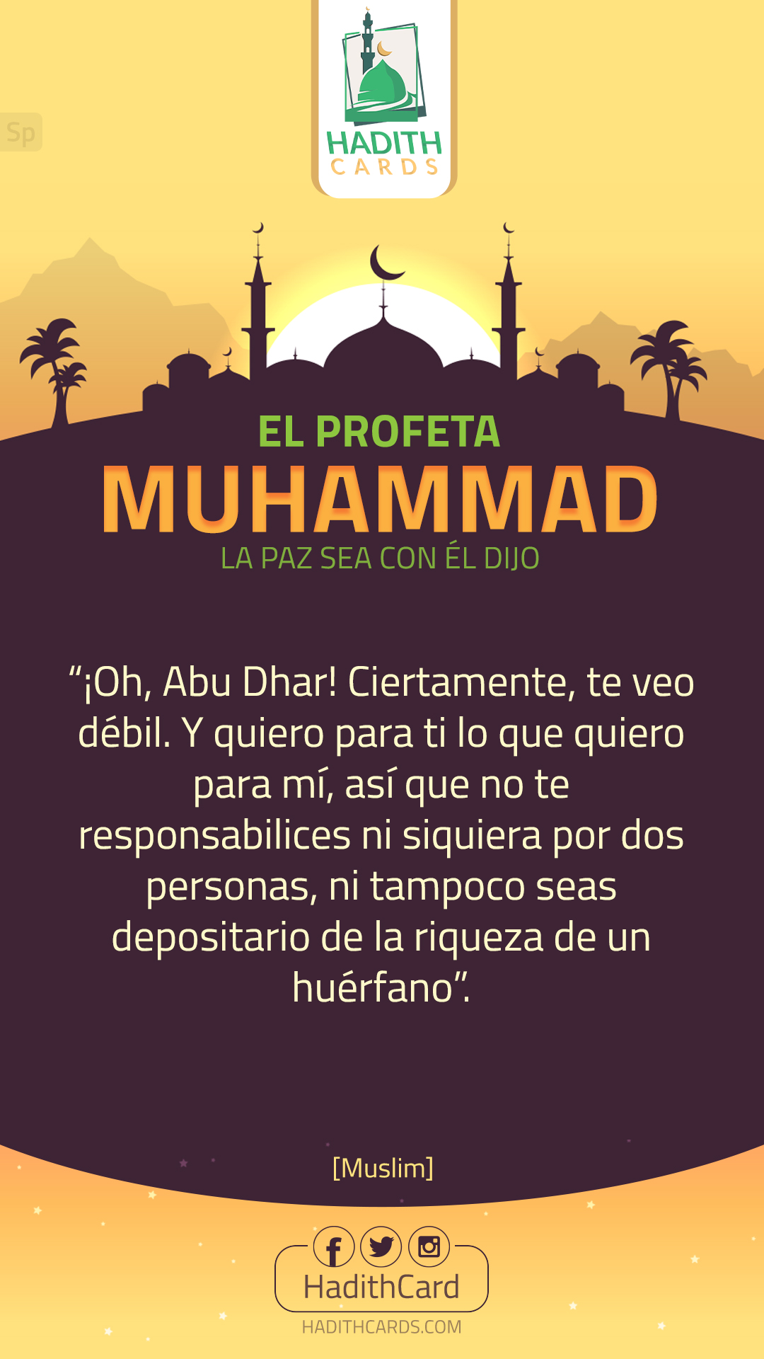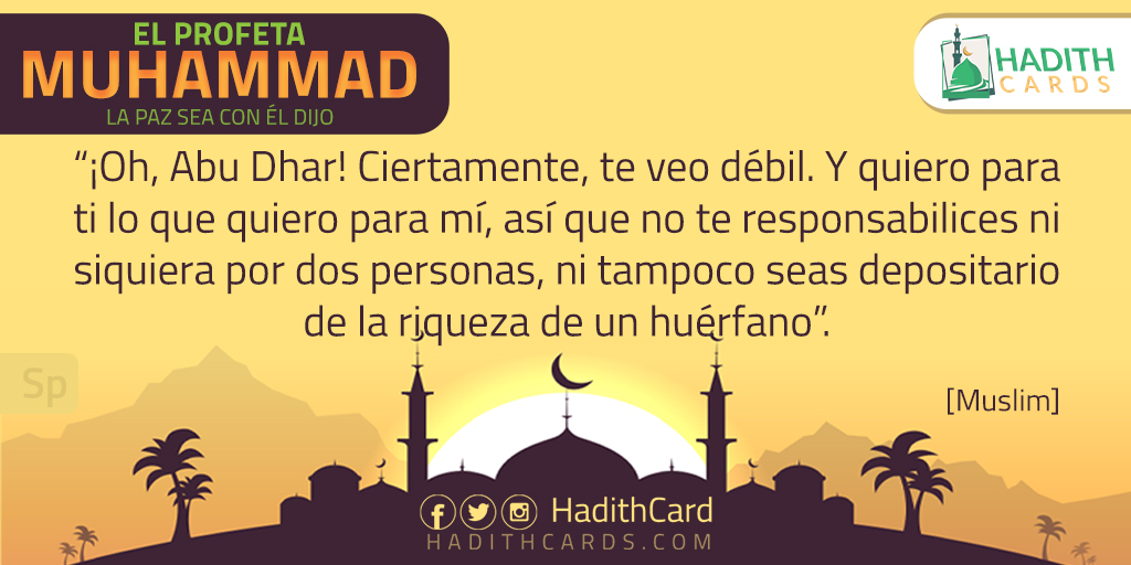 ¡Oh, Abu Dhar! Ciertamente, te veo débil. Y quiero para ti lo que quiero para mí, así que no te responsabilices ni siquiera por dos personas, ni tampoco seas depositario de la riqueza de un huérfano