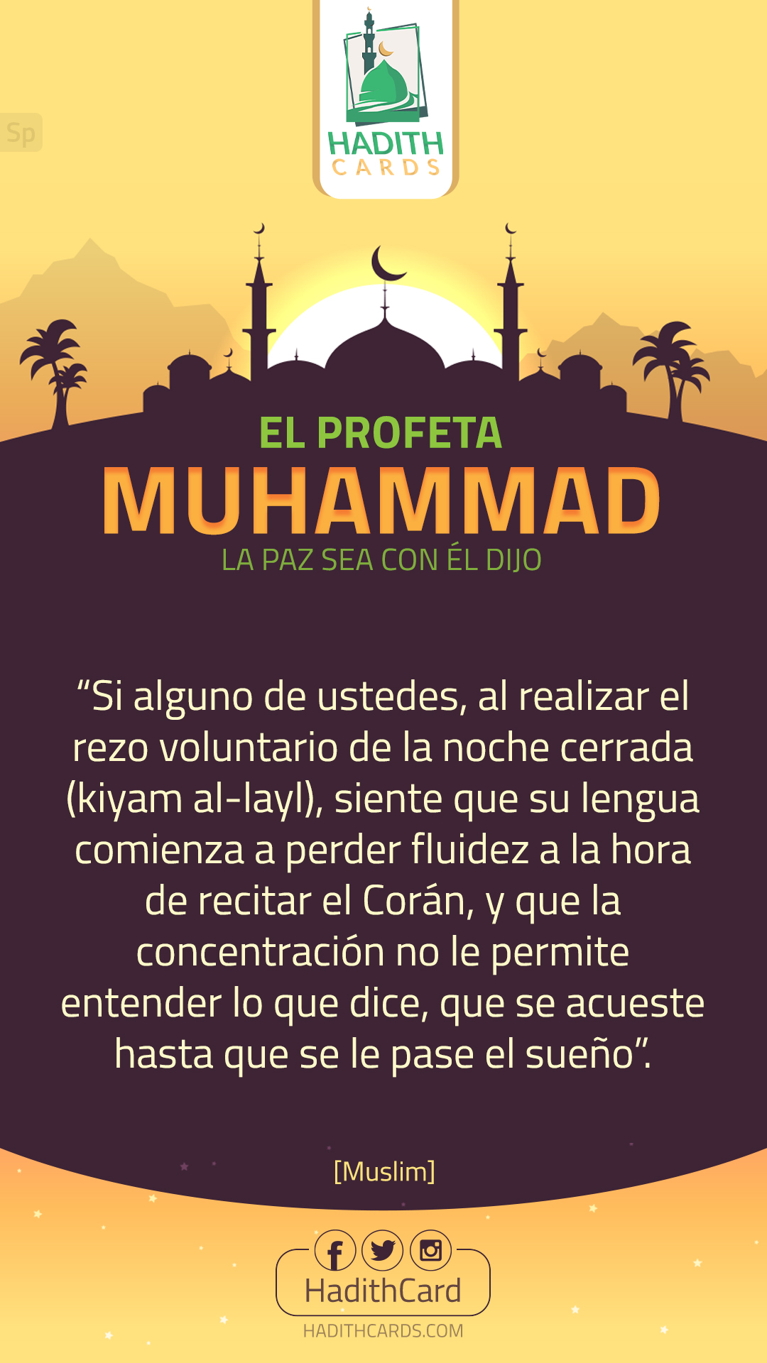 Si alguno de ustedes, al realizar el rezo voluntario de la noche cerrada (kiyam al-layl), siente que su lengua comienza a perder fluidez a la hora de recitar el Corán, y que la concentración no le permite entender lo que dice, que se acueste hasta que se le pase el sueño