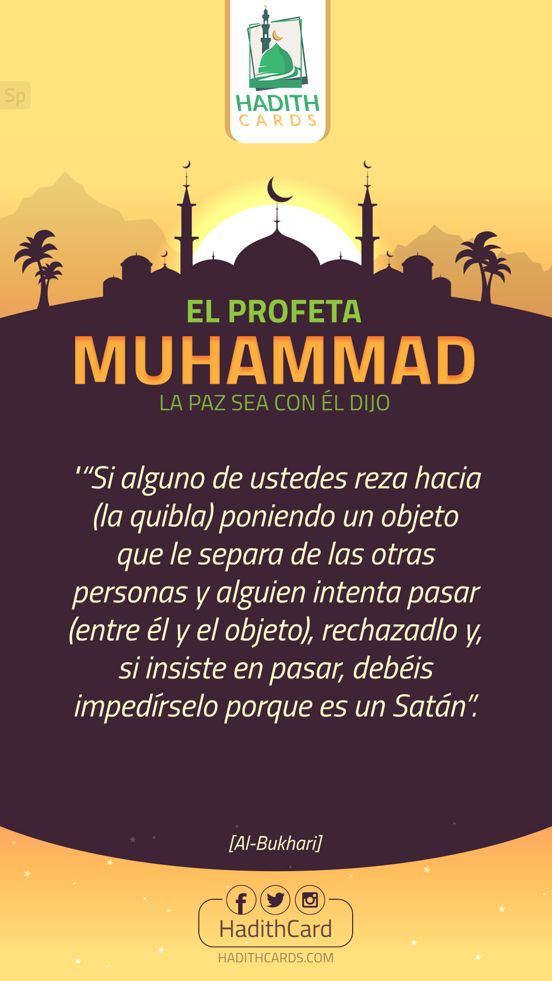 Si alguno de ustedes reza hacia (la quibla) poniendo un objeto que le separa de las otras personas y alguien intenta pasar (entre él y el objeto), rechazadlo y, si insiste en pasar, debéis impedírselo porque es un Satán