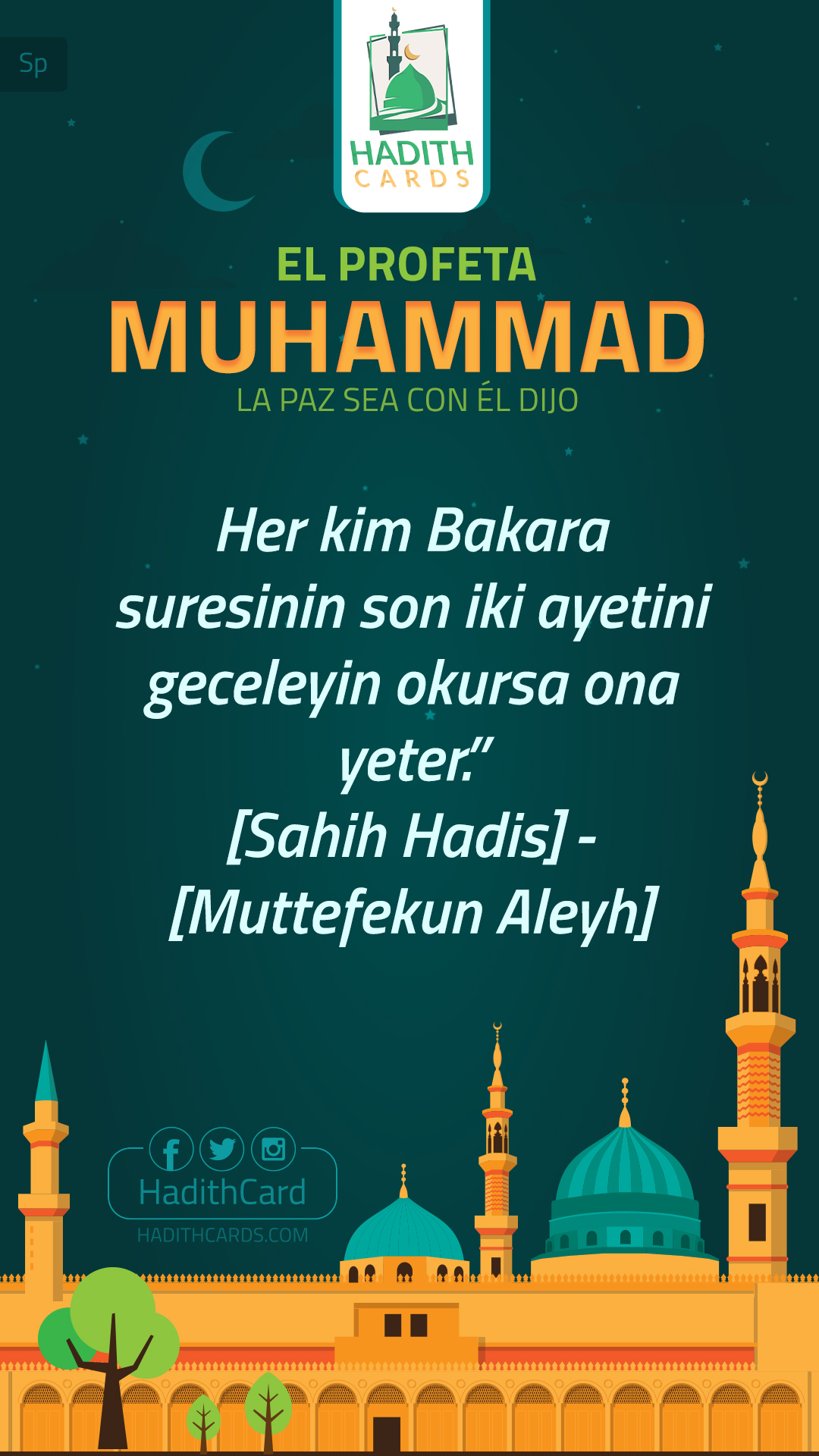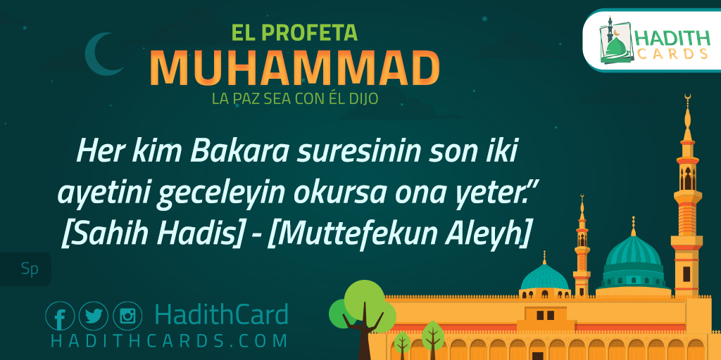 «مَنْ قَرَأَ بِالآيَتَيْنِ مِنْ آخر سُورَةِ البَقَرَةِ في لَيْلَةٍ كَفَتَاه». رواه البخاري.