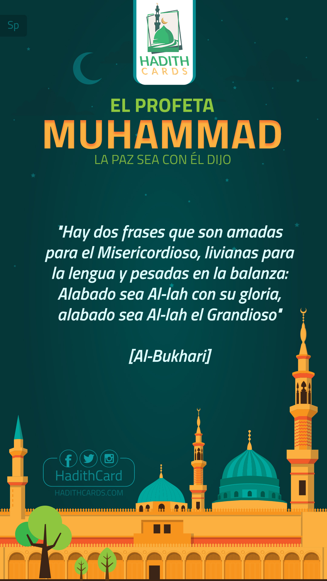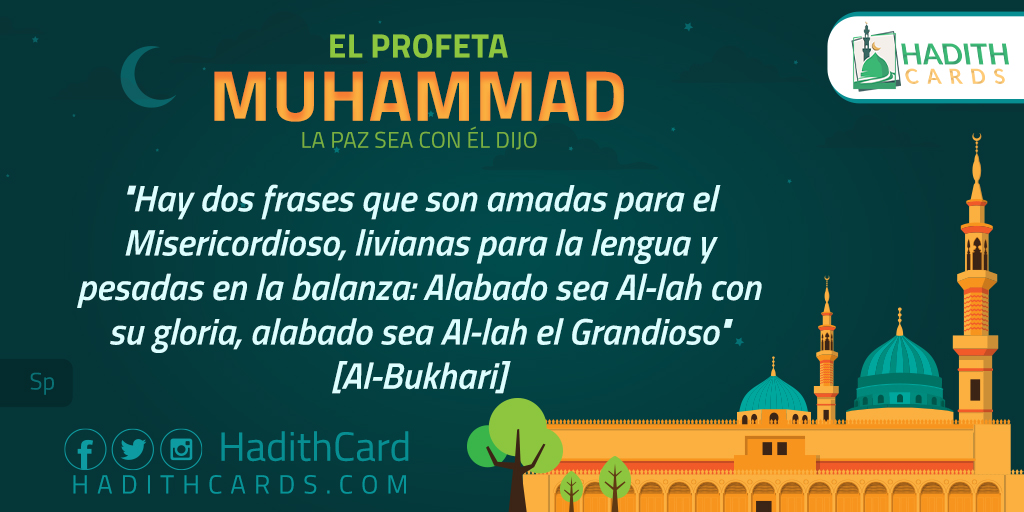Hay dos frases que son amadas para el Misericordioso, livianas para la lengua y pesadas en la balanza: Alabado sea Al-lah con su gloria, alabado sea Al-lah el Grandioso
