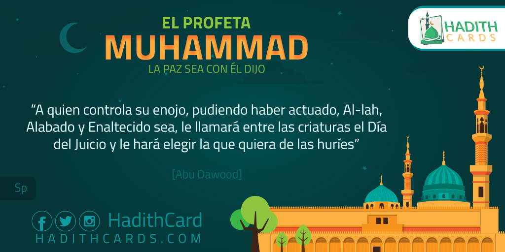 A quien controla su enojo, pudiendo haber actuado, Al-lah, Alabado y Enaltecido sea, le llamará entre las criaturas el Día del Juicio y le hará elegir la que quiera de las huríes