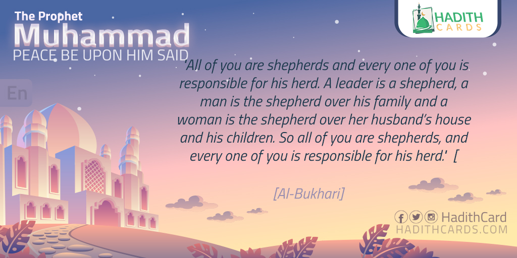 All of you are shepherds and every one of you is responsible for his herd. A leader is a shepherd, a man is the shepherd over his family and a woman is the shepherd over her husband’s house and his children. So all of you are shepherds, and every one of you is responsible for his herd. [Al-Bukhari]