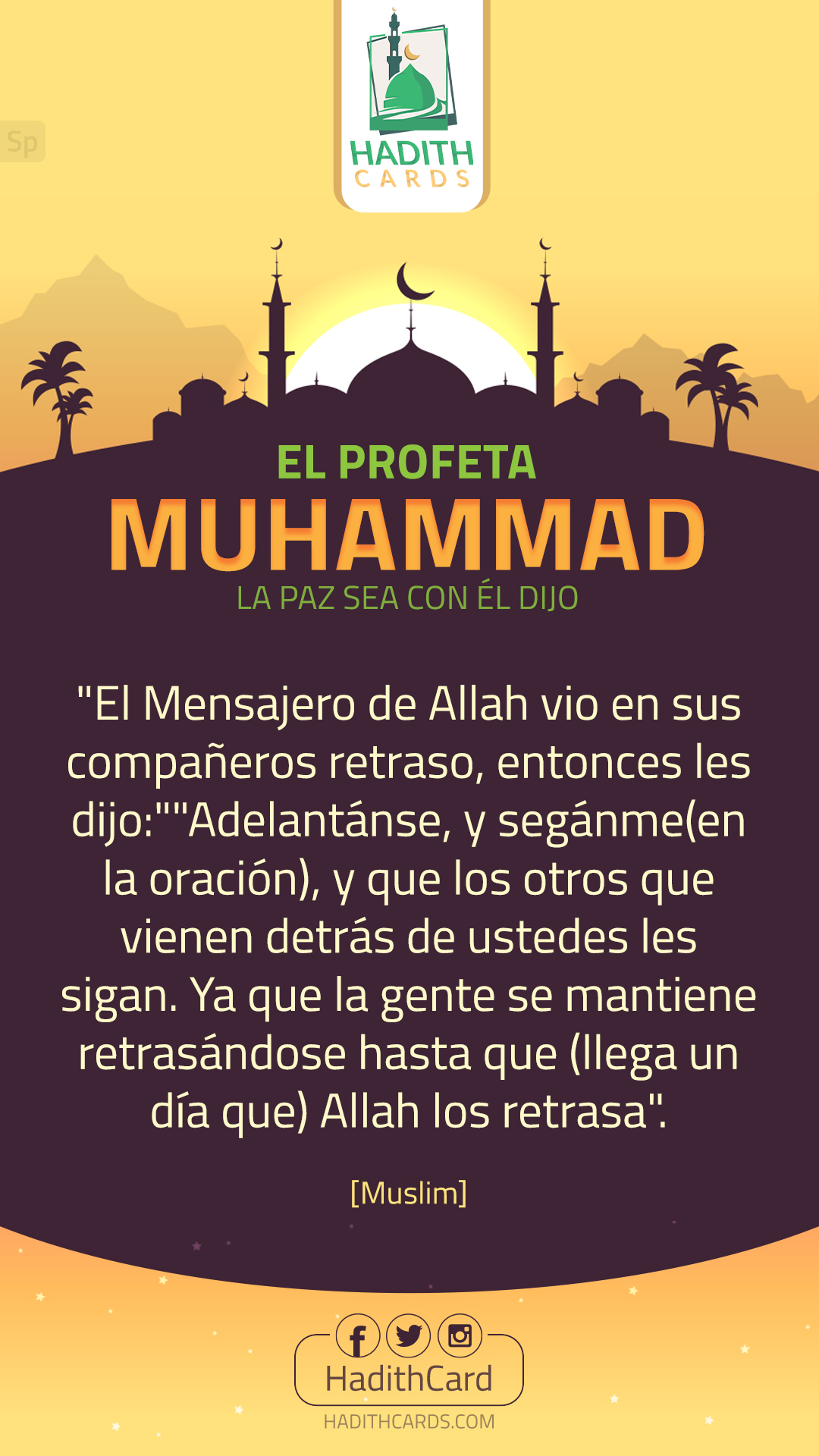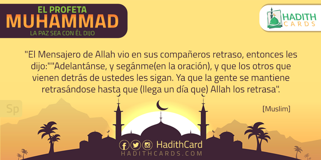 El Mensajero de Allah vio en sus compañeros retraso, entonces les dijo:"Adelantánse, y segánme(en la oración), y que los otros que vienen detrás de ustedes les sigan. Ya que la gente se mantiene retrasándose hasta que (llega un día que) Allah los retrasa