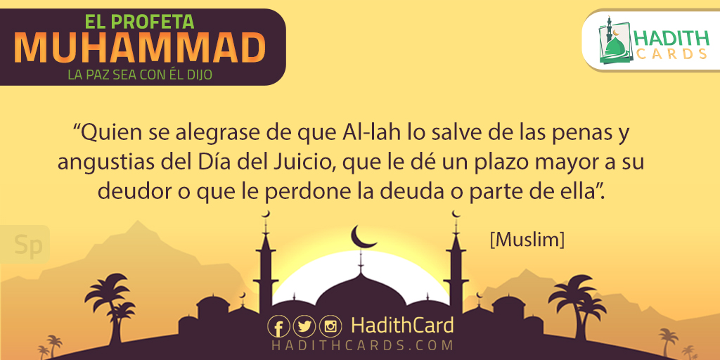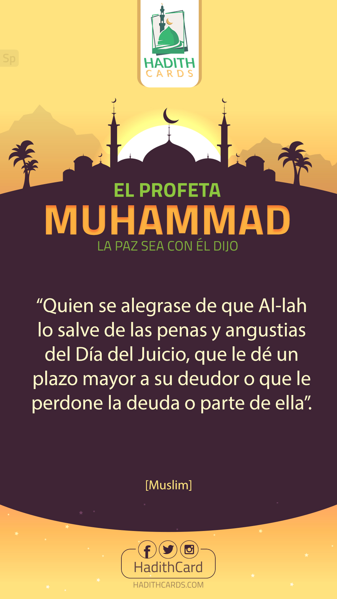 Quien se alegrase de que Al-lah lo salve de las penas y angustias del Día del Juicio, que le dé un plazo mayor a su deudor o que le perdone la deuda o parte de ella