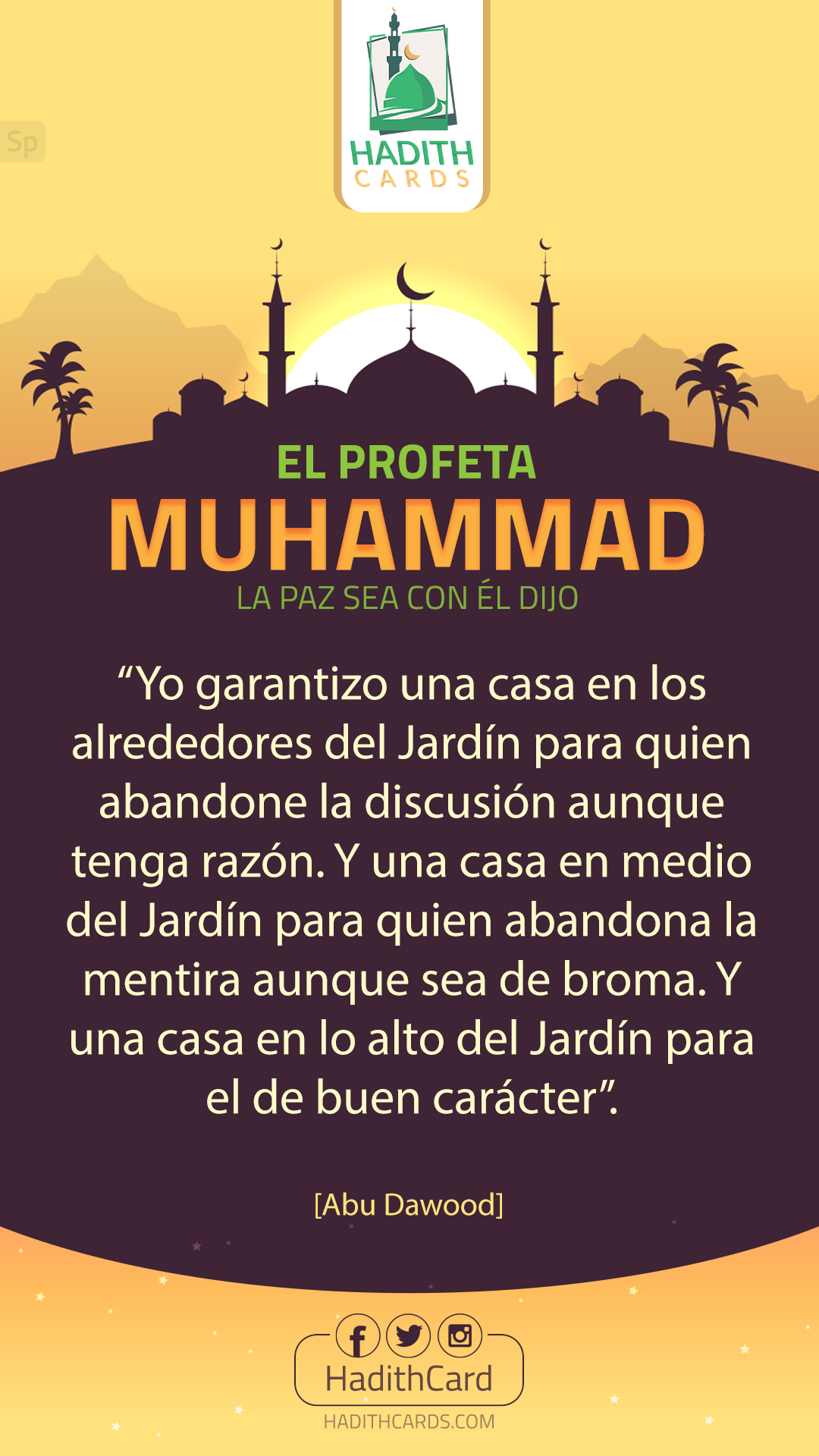 "«أنا زعيم ببيت في رَبَضِ الجنة لمن ترك المِرَاءَ وإن كان مُحِقًّا، وببيت في وسط الجنة لمن ترك الكذب وإن كان مازحاً، وببيت في أعلى الجنة لمن حَسَّنَ خلقه»