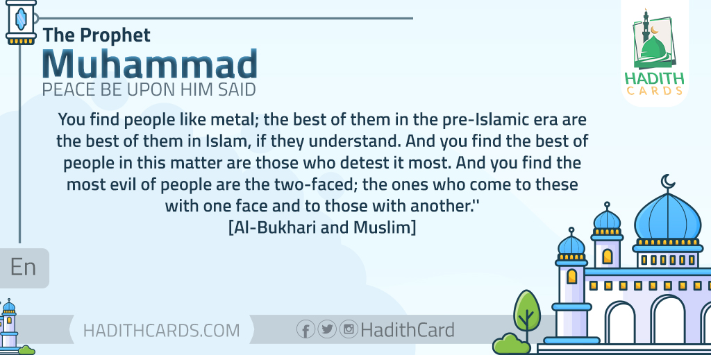 You find people like metal; the best of them in the pre-Islamic era are the best of them in Islam, if they understand. And you find the best of people in this matter are those who detest it most. And you find the most evil of people are the two-faced; the ones who come to these with one face and to those with another. [Al-Bukhari and Muslim]