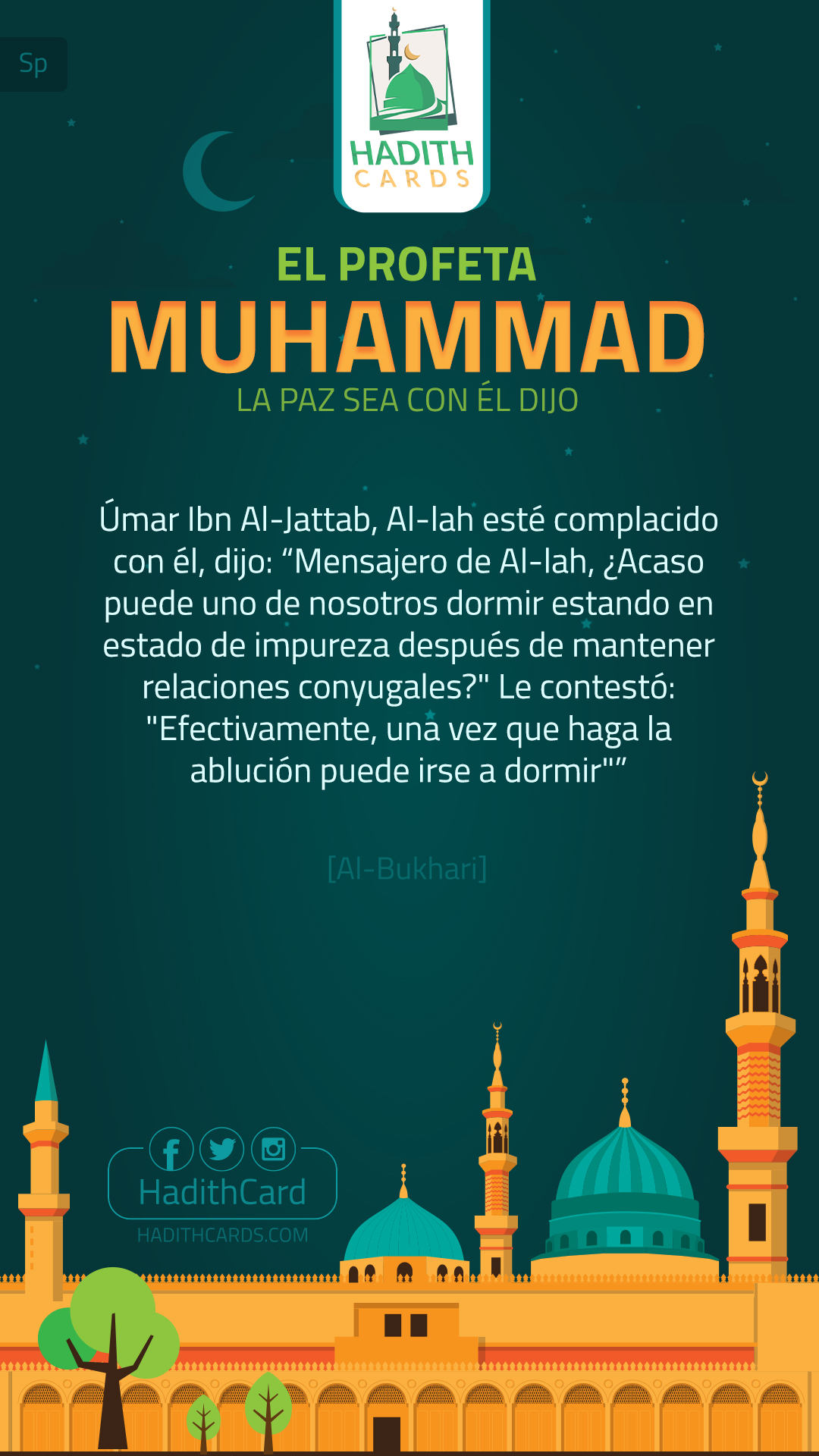 "عن عبد الله بنِ عمر -رضي الله عنهما- أن عمرَ بْن الخطاب -رضي الله عنه- قال: ((يا رسول الله، أّيَرقُدُ أَحَدُنا وهو جُنُب؟ قال: نعم، إِذَا تَوَضَّأ أَحَدُكُم فَليَرقُد)).