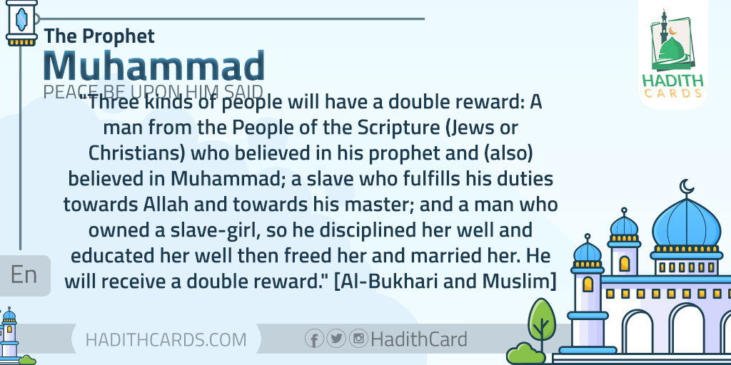 «ثلاثة لهم أجران: رجل من أهل الكتاب آمن بنبيه، وآمن بمحمد، والعبد المملوك إذا أدى حق الله، وحق مواليه، ورجل كانت له أمة فأدبها فأحسن تأديبها، وعلمها فأحسن تعليمها، ثم أعتقها فتزوجها؛ فله أجران».