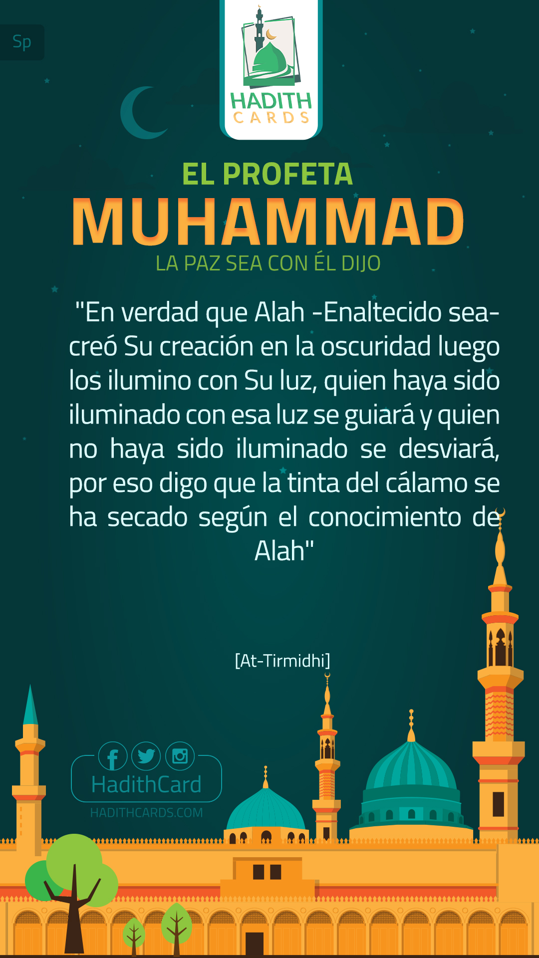 En verdad que Alah -Enaltecido sea- creó Su creación en la oscuridad luego los ilumino con Su luz, quien haya sido iluminado con esa luz se guiará y quien no haya sido iluminado se desviará, por eso digo que la tinta del cálamo se ha secado según el conocimiento de Alah