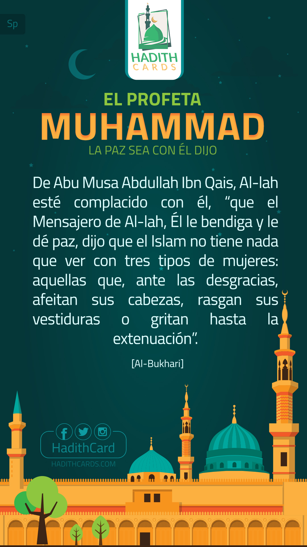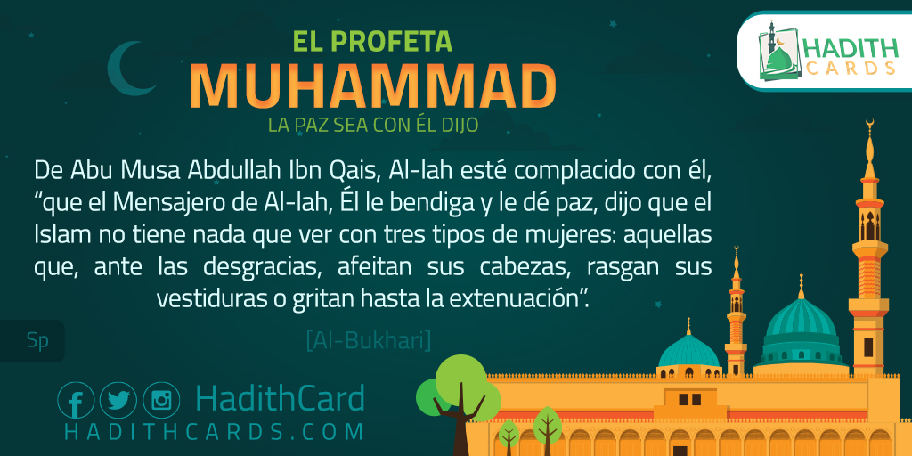 De Abu Musa Abdullah Ibn Qais, Al-lah esté complacido con él, “que el Mensajero de Al-lah, Él le bendiga y le dé paz, dijo que el Islam no tiene nada que ver con tres tipos de mujeres: aquellas que, ante las desgracias, afeitan sus cabezas, rasgan sus vestiduras o gritan hasta la extenuación